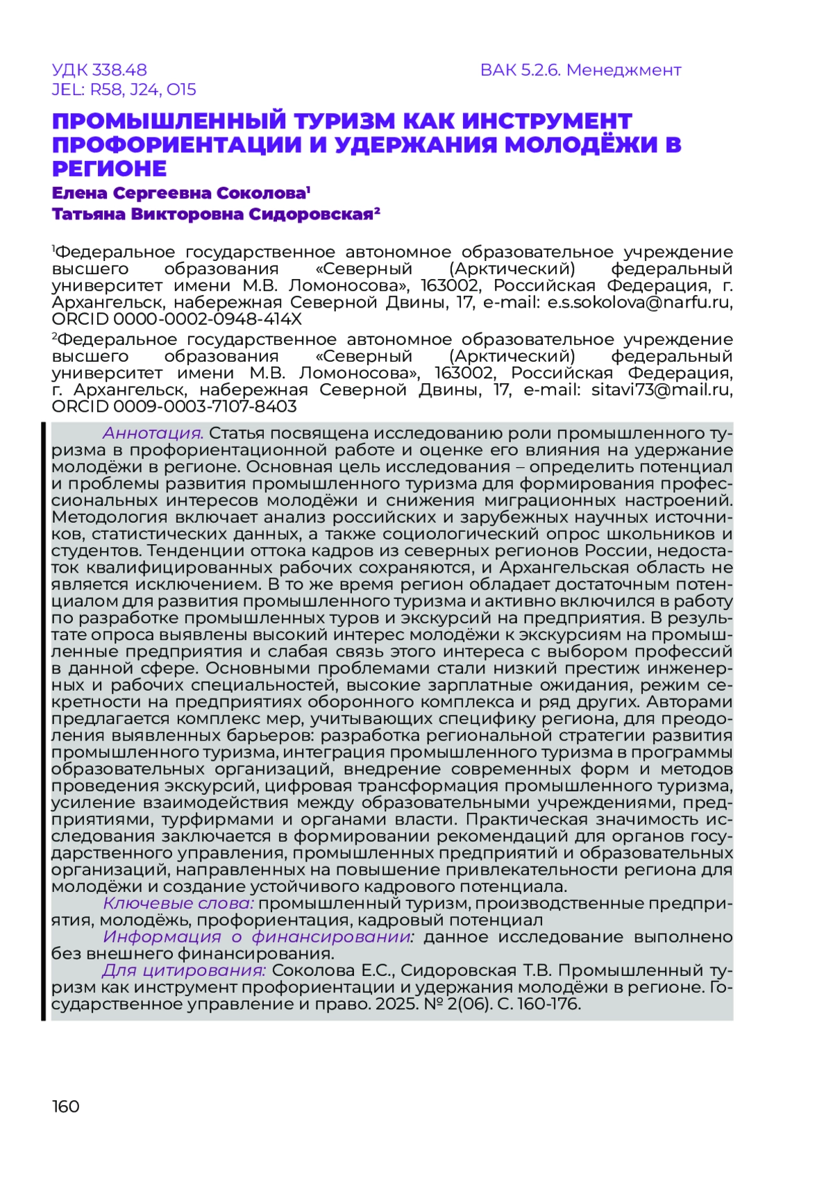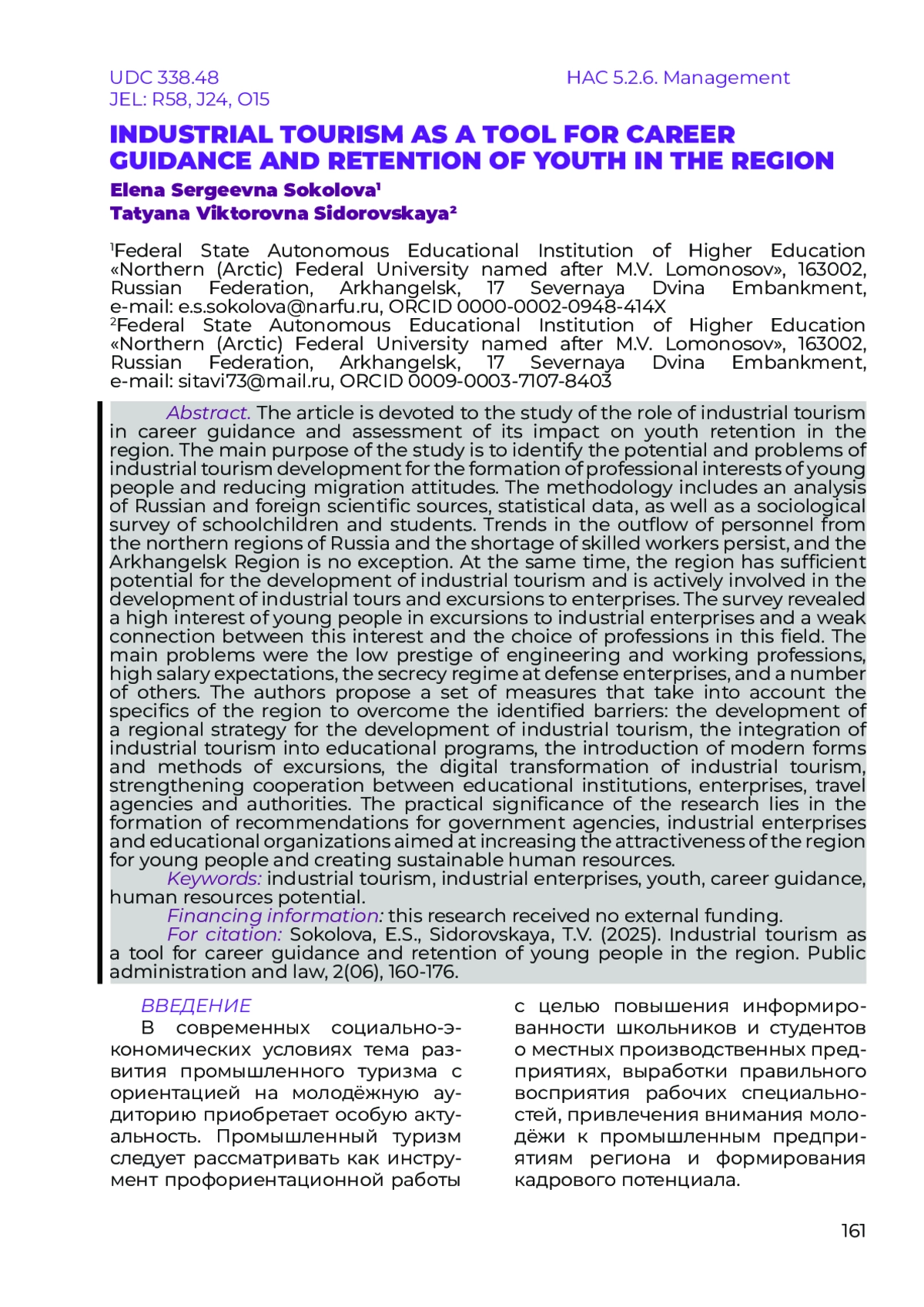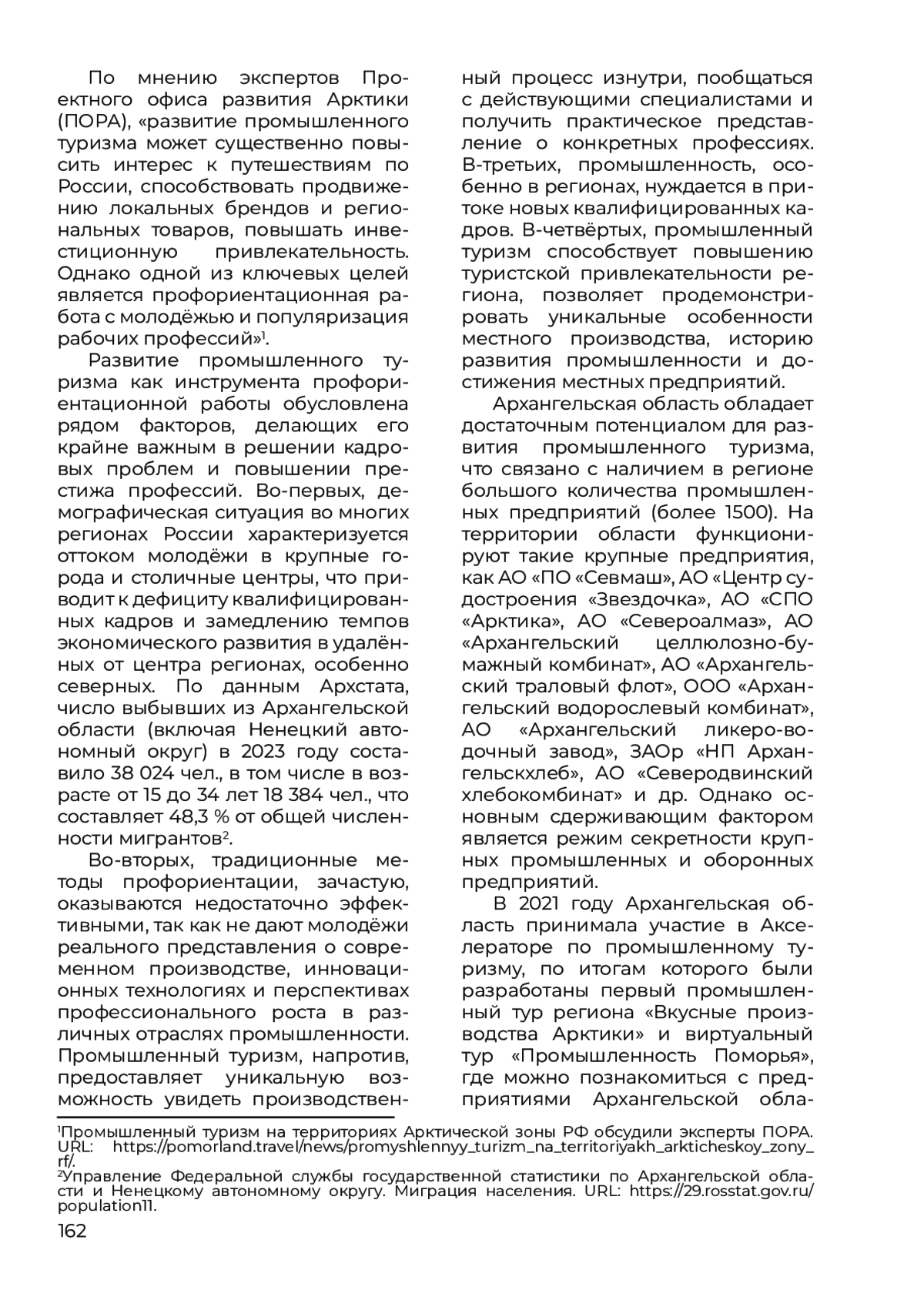 Статья посвящена исследованию роли промышленного туризма в профориентационной работе и оценке его влияния на удержание молодёжи в регионе. Основная цель исследования – определить потенциал и проблемы развития промышленного туризма для формирования профессиональных интересов молодёжи и снижения миграционных настроений. Методология включает анализ российских и зарубежных научных источников, статистических данных, а также социологический опрос школьников и студентов. Тенденции оттока кадров из северных регионов России, недостаток квалифицированных рабочих сохраняются, и Архангельская область не является исключением. В то же время регион обладает достаточным потенциалом для развития промышленного туризма и активно включился в работу по разработке промышленных туров и экскурсий на предприятия. В результате опроса выявлены высокий интерес молодёжи к экскурсиям на промышленные предприятия и слабая связь этого интереса с выбором профессий в данной сфере. Основными проблемами стали низкий престиж инженерных и рабочих специальностей, высокие зарплатные ожидания, режим секретности на предприятиях оборонного комплекса и ряд других. Авторами предлагается комплекс мер, учитывающих специфику региона, для преодоления выявленных барьеров: разработка региональной стратегии развития промышленного туризма, интеграция промышленного туризма в программы образовательных организаций, внедрение современных форм и методов проведения экскурсий, цифровая трансформация промышленного туризма, усиление взаимодействия между образовательными учреждениями, предприятиями, турфирмами и органами власти. Практическая значимость исследования заключается в формировании рекомендаций для органов государственного управления, промышленных предприятий и образовательных организаций, направленных на повышение привлекательности региона для молодёжи и создание устойчивого кадрового потенциала.