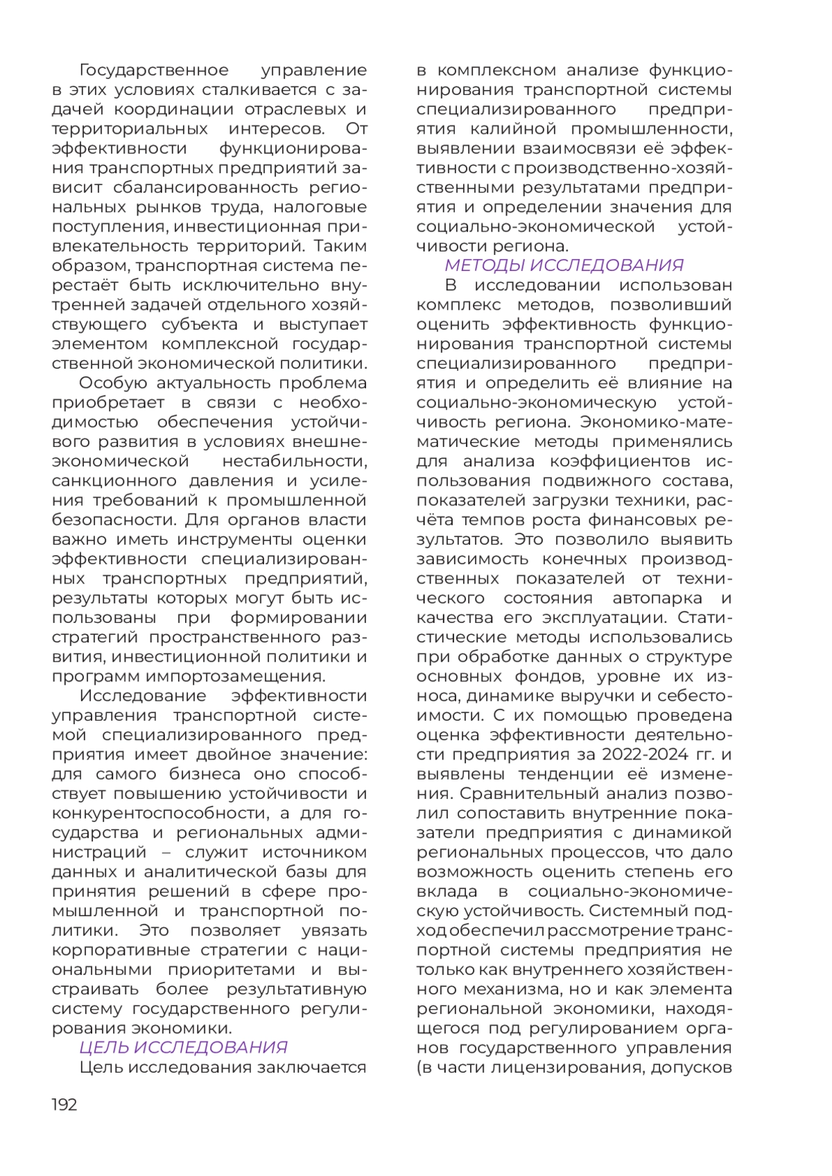 В статье приведены результаты исследований эффективности использования подвижного состава специализированного транспортного предприятия калийной промышленности ТУП «Калийспецтранс», от которого во многом зависят конечные показатели работы любого автотранспортного предприятия. При этом эффективность предприятия должна коррелироваться с процессами, происходящими в регионе, и оказывать позитивное влияние на его социально-экономическую устойчивость. Специальное разрешение Министерства транспорта и коммуникаций Республики Беларусь позволяет исследуемому предприятию оказывать услуги по перевозке грузов и пассажиров не только по территории Республики Беларусь, но и в международном сообщении. Из имеющейся грузовой техники почти три десятка единиц зарегистрировано в Госпроматомнадзоре, а также имеют необходимые допуски и оборудованы для перевозки опасных грузов. Помимо перевозки горюче-смазочных материалов предприятие осуществляет перевозки (в том числе и международные) кислорода, взрывчатых материалов, аргона, азота, ацетилена, лакокрасочной продукции, гипохлорита натрия, высококонцентрированных кислот, гидроксида калия и других видов опасных грузов, что подтверждает узкоспециализированный аспект, ориентированный на калийную промышленность. Кроме того, у исследуемого предприятия имеется большой опыт перевозок крупногабаритных и тяжеловесных грузов, для осуществления которых необходимо получить специальное разрешение на проезд. Перевозки данных грузов способствуют увеличению общего объёма грузоперевозок. При этом износ активной части основных производственных фондов с учётом полезного срока использования составит 62,3 %, а техническое обслуживание и ремонт автотракторной техники, диагностика подвижного состава и его агрегатов, другого оборудования, приспособлений и инструмента осуществляется преимущественно силами собственного ремонтного персонала.