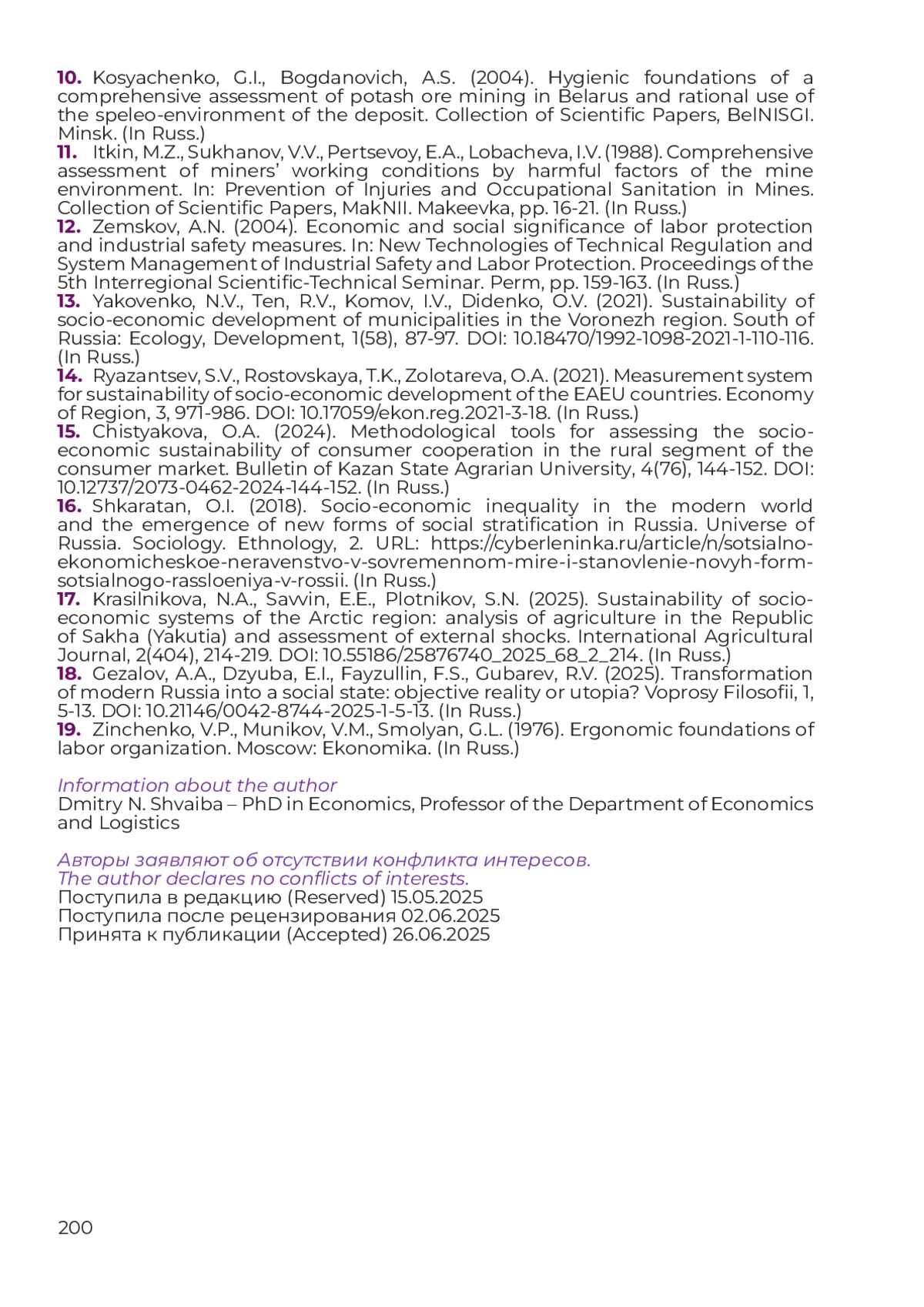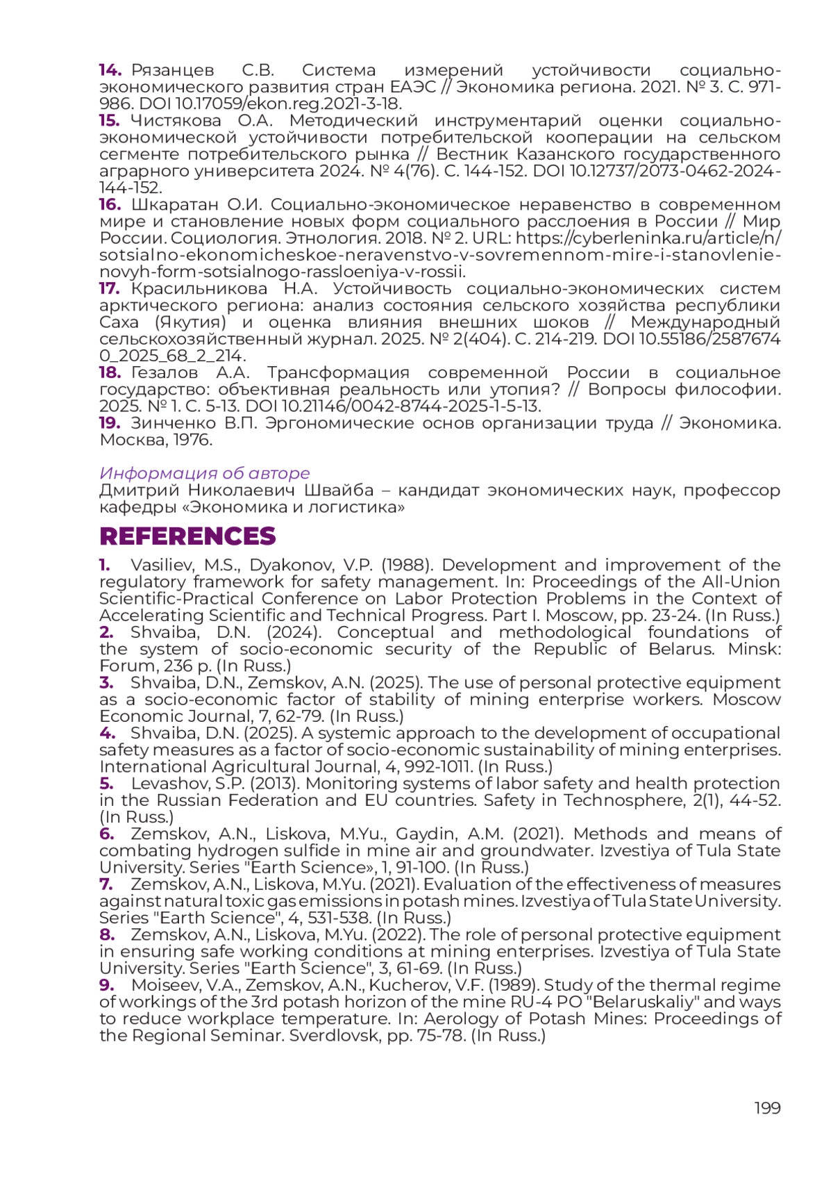 3. Швайба Д.Н. Применение средств индивидуальной защиты – социально-экономический фактор устойчивости трудящихся горнодобывающих предприятий // Московский экономический журнал. 2025. № 7. С. 62-79.