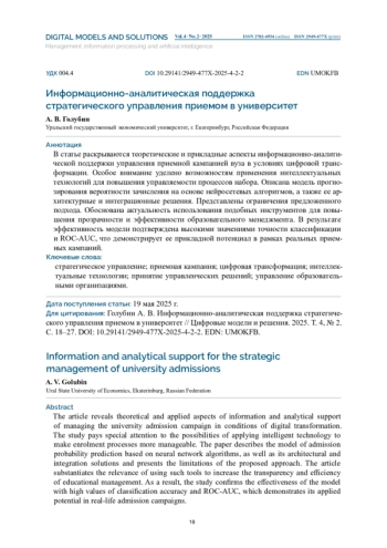 В статье раскрываются теоретические и прикладные аспекты информационно-аналитической поддержки управления приемной кампанией вуза в условиях цифровой трансформации. Особое внимание уделено возможностям применения интеллектуальных технологий для повышения управляемости процессов набора. Описана модель прогнозирования вероятности зачисления на основе нейросетевых алгоритмов, а также ее архитектурные и интеграционные решения. Представлены ограничения предложенного подхода. Обоснована актуальность использования подобных инструментов для повышения прозрачности и эффективности образовательного менеджмента. В результате эффективность модели подтверждена высокими значениями точности классификации и ROC-AUC, что демонстрирует ее прикладной потенциал в рамках реальных приемных кампаний