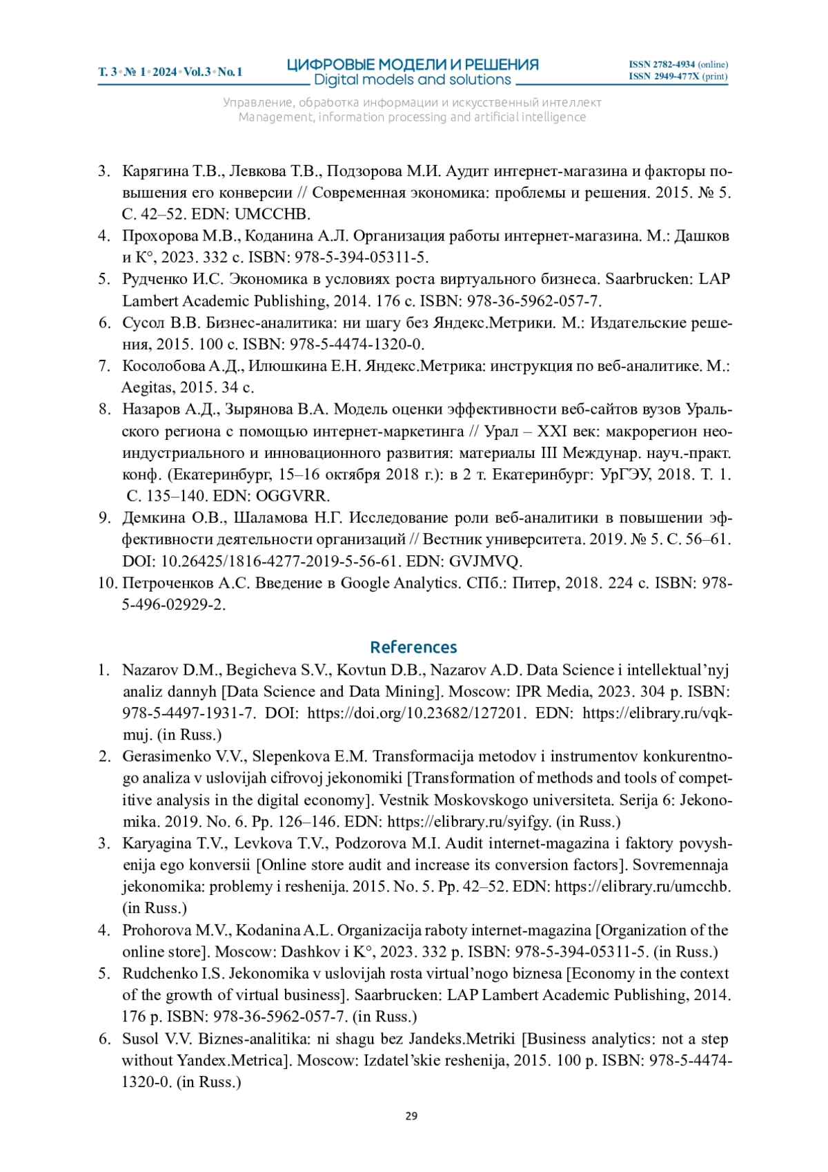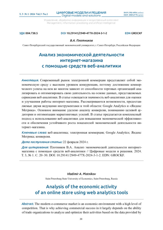 Современный рынок электронной коммерции представляет собой экономическую среду с высоким уровнем конкуренции, поэтому достижение коммерческого успеха на нем во многом зависит от способности торговых организаций анализировать и оптимизировать свою деятельность на основе данных, представляемых сервисами веб-аналитики. В статье освещается значимость веб-аналитики для оценки и улучшения работы интернет-магазина. Рассматриваются возможности, предоставляемые двумя ведущими инструментами в этой области: Google Analytics и «Яндекс Метрика». Основное внимание уделено анализу конверсии, пониманию целевой аудитории и оптимизации маркетинговых усилий. В статье предлагается комплексный подход к использованию веб-аналитики для повышения экономической эффективности и обеспечения устойчивого роста показателей экономической деятельности интернет-магазина