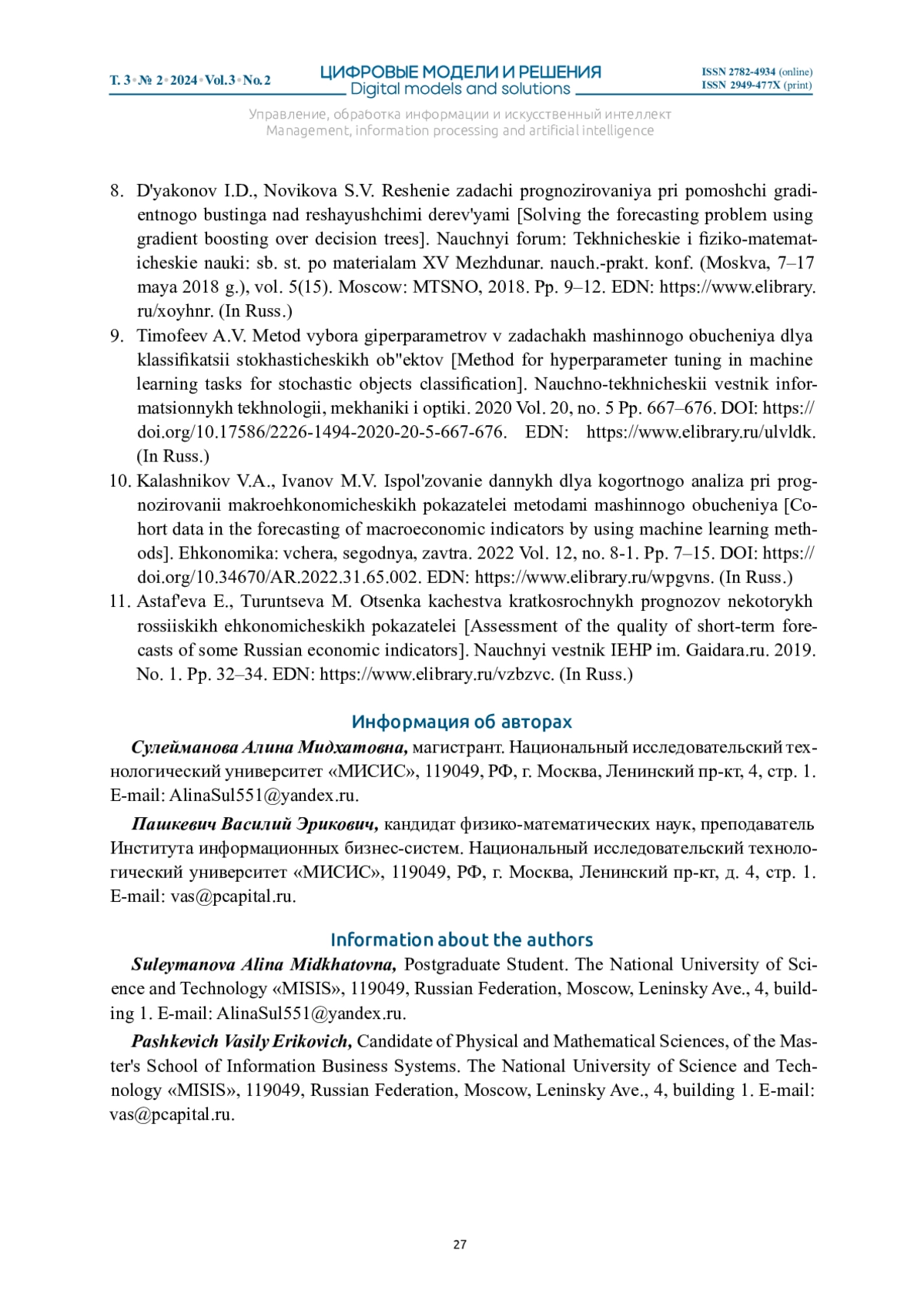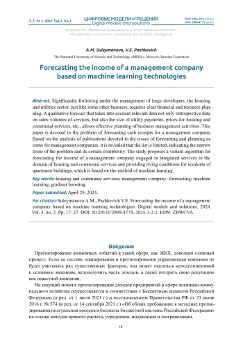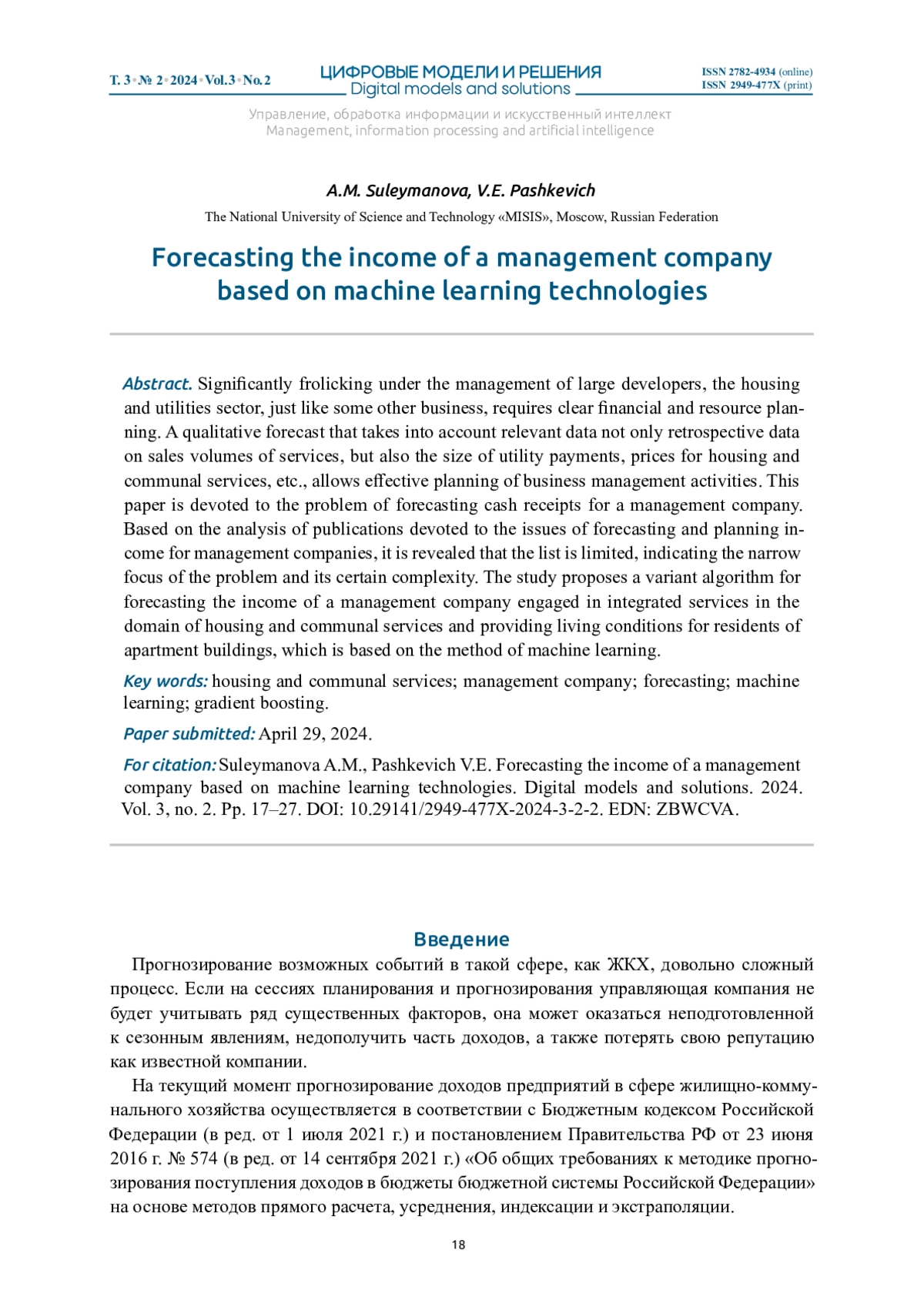 СУЛЕЙМАНОВА А. М., ПАШКЕВИЧ В. Э. ПРОГНОЗИРОВАНИЕ ДОХОДА УПРАВЛЯЮЩЕЙ КОМПАНИИ НА ОСНОВЕ ТЕХНОЛОГИЙ МАШИННОГО ОБУЧЕНИЯ // ЦИФРОВЫЕ МОДЕЛИ И РЕШЕНИЯ. 2024. Т. 3 № 2