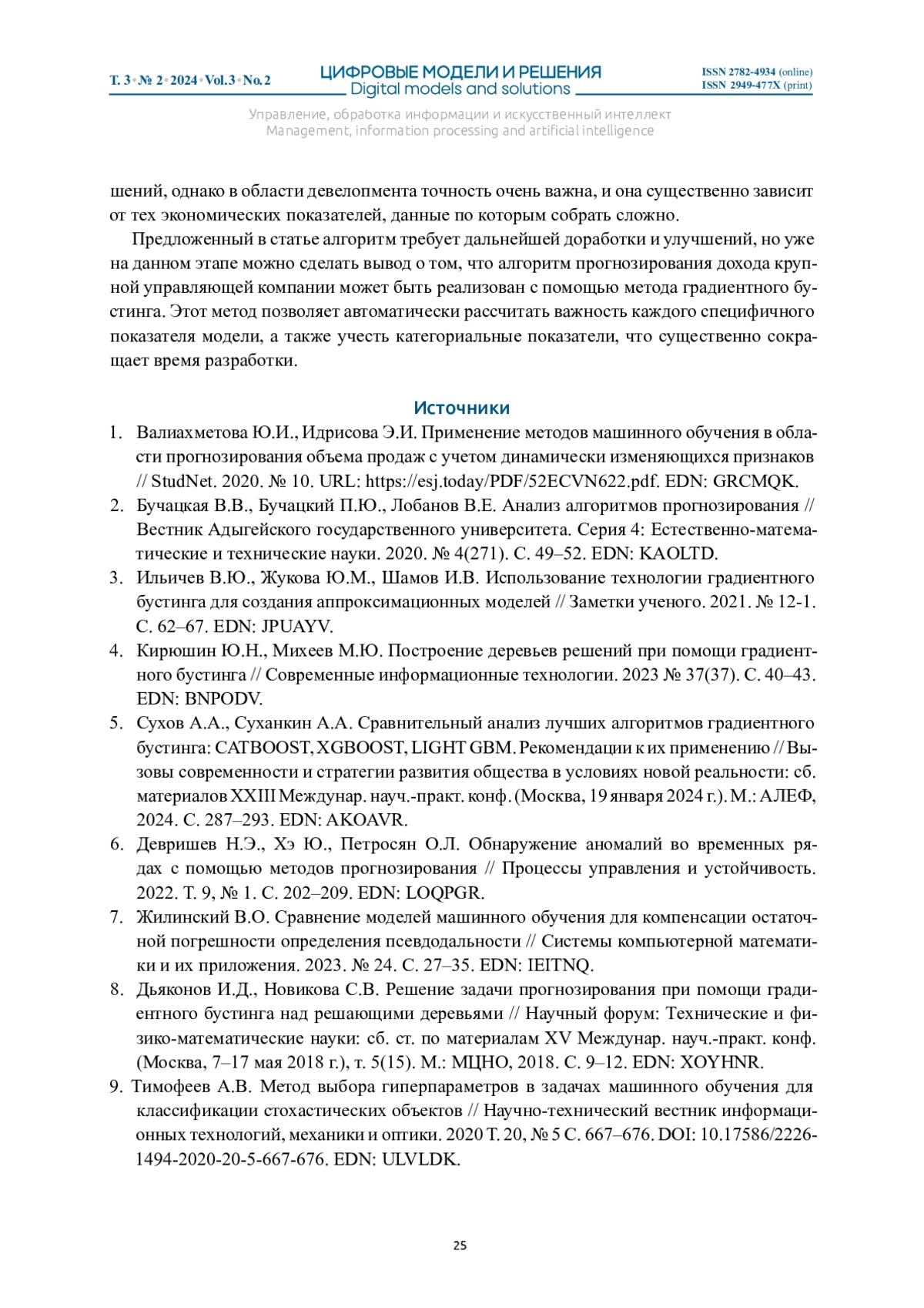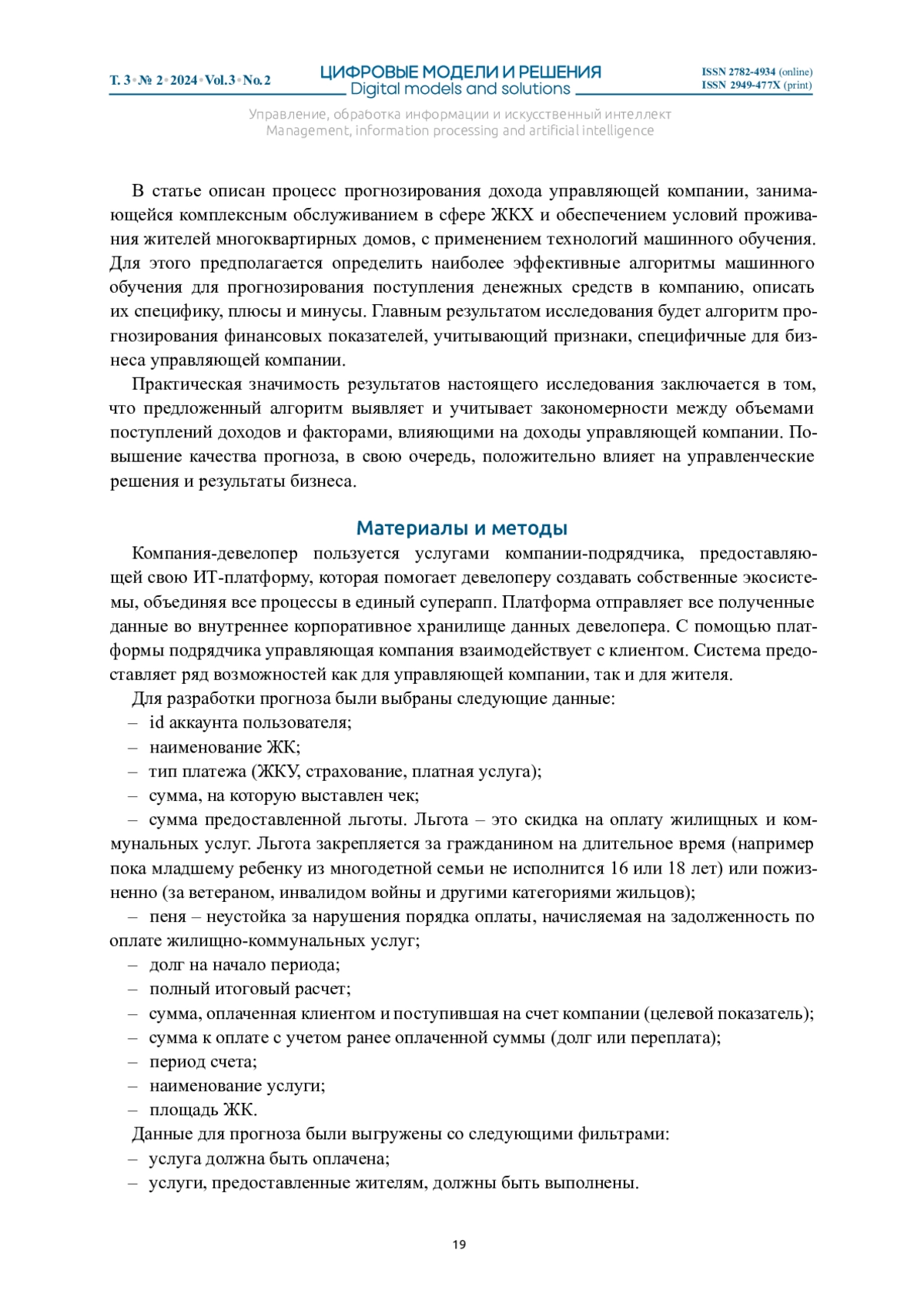Статья: ПРОГНОЗИРОВАНИЕ ДОХОДА УПРАВЛЯЮЩЕЙ КОМПАНИИ НА ОСНОВЕ ТЕХНОЛОГИЙ МАШИННОГО ОБУЧЕНИЯ (2024)