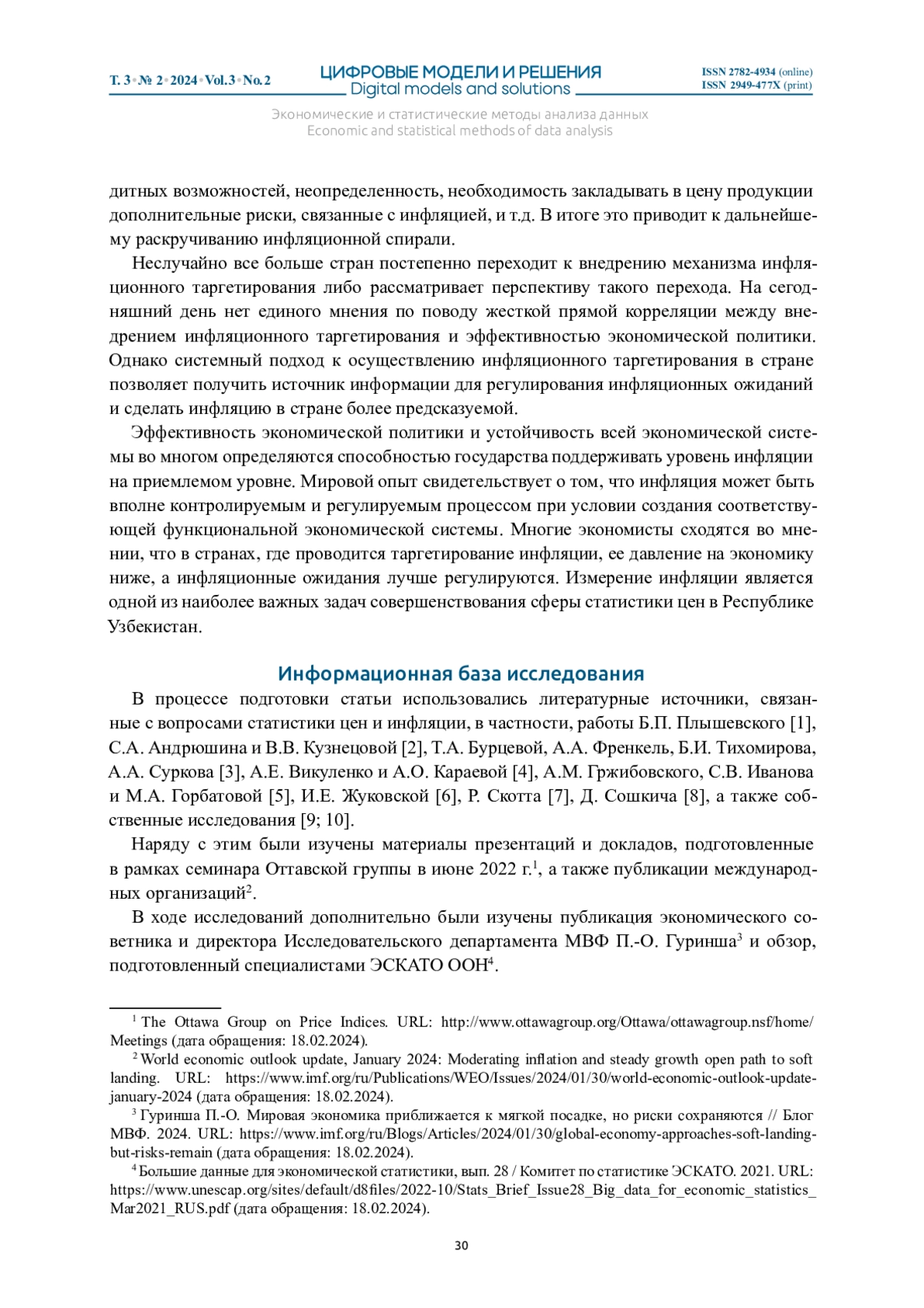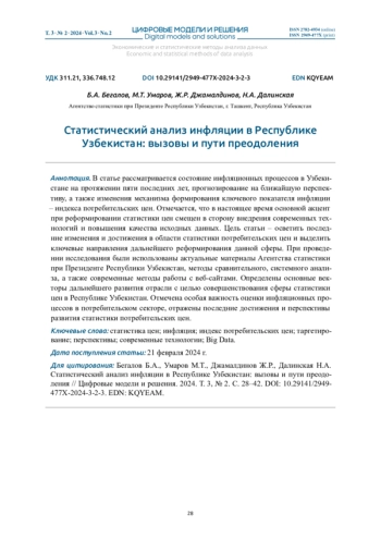 В статье рассматривается состояние инфляционных процессов в Узбекистане на протяжении пяти последних лет, прогнозирование на ближайшую перспективу, а также изменения механизма формирования ключевого показателя инфляции – индекса потребительских цен. Отмечается, что в настоящее время основной акцент при реформировании статистики цен смещен в сторону внедрения современных технологий и повышения качества исходных данных. Цель статьи – осветить последние изменения и достижения в области статистики потребительских цен и выделить ключевые направления дальнейшего реформирования данной сферы. При проведении исследования были использованы актуальные материалы Агентства статистики при Президенте Республики Узбекистан, методы сравнительного, системного анализа, а также современные методы работы с веб-сайтами. Определены основные векторы дальнейшего развития отрасли с целью совершенствования сферы статистики цен в Республике Узбекистан. Отмечена особая важность оценки инфляционных процессов в потребительском секторе, отражены последние достижения и перспективы развития статистики потребительских цен
