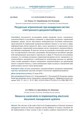 Статья: РЕСУРСНЫЕ ОГРАНИЧЕНИЯ ПРИ ВНЕДРЕНИИ СИСТЕМ ЭЛЕКТРОННОГО ДОКУМЕНТООБОРОТА (2024)