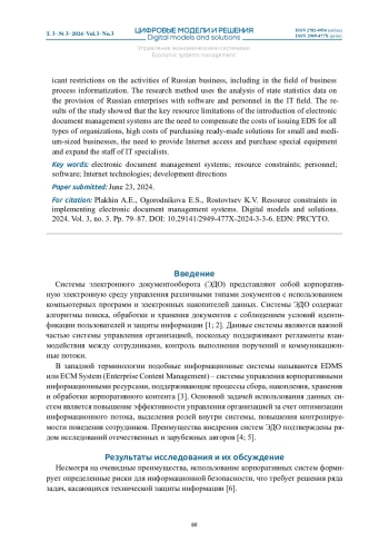 ПЛАХИН А. Е., ОГОРОДНИКОВА Е. С., РОСТОВЦЕВ К. В. РЕСУРСНЫЕ ОГРАНИЧЕНИЯ ПРИ ВНЕДРЕНИИ СИСТЕМ ЭЛЕКТРОННОГО ДОКУМЕНТООБОРОТА // ЦИФРОВЫЕ МОДЕЛИ И РЕШЕНИЯ. 2024. Т. 3 № 3