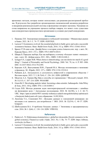 1. Панкова Л.Н. Электронная коммерция в глобальной экономике // Финансовые рынки и банки. 2021. № 5. С. 74-77. EDN: OLWYKX