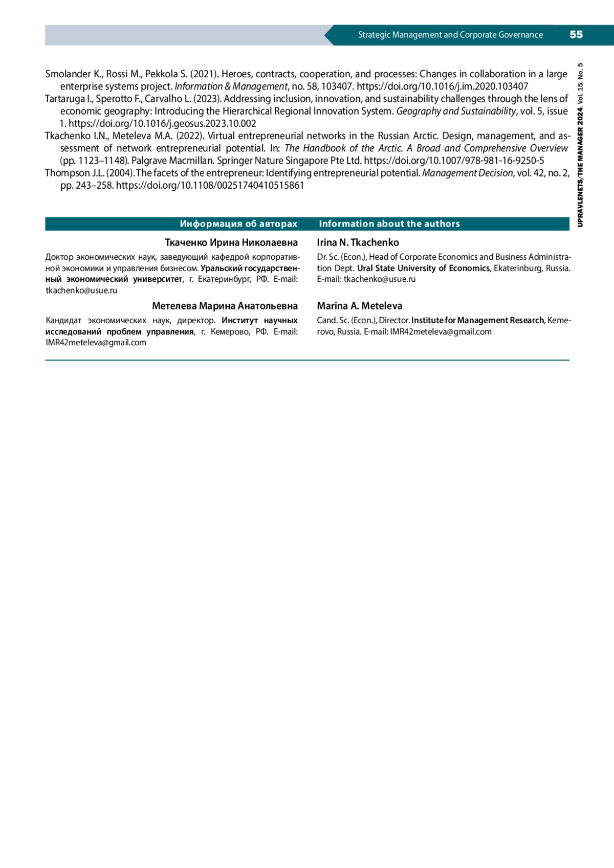 ТКАЧЕНКО И. Н., МЕТЕЛЕВА М. А. СТРУКТУРНЫЕ ЭЛЕМЕНТЫ И РЕЗУЛЬТАТИВНОСТЬ СИСТЕМ УПРАВЛЕНИЯ ПРЕДПРИНИМАТЕЛЬСКОЙ ДЕЯТЕЛЬНОСТЬЮ КОРПОРАЦИЙ // УПРАВЛЕНЕЦ. 2024. Т. 15 № 5