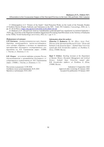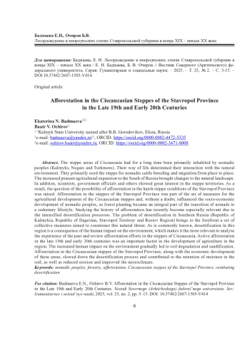 БАДМАЕВА Е. Н., ОЧИРОВ Б. В. ЛЕСОРАЗВЕДЕНИЕ В ИНОРОДЧЕСКИХ СТЕПЯХ СТАВРОПОЛЬСКОЙ ГУБЕРНИИ В КОНЦЕ XIX - НАЧАЛЕ XX ВЕКА // ВЕСТНИК СЕВЕРНОГО (АРКТИЧЕСКОГО) ФЕДЕРАЛЬНОГО УНИВЕРСИТЕТА. СЕРИЯ: ГУМАНИТАРНЫЕ И СОЦИАЛЬНЫЕ НАУКИ. 2025. Т. 25 № 2
