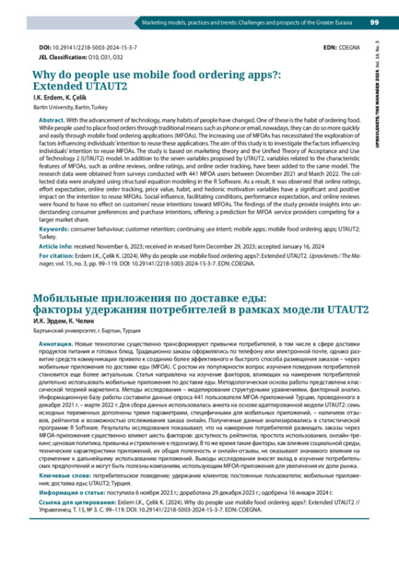 ERDEM I. K., ÇELIK K. WHY DO PEOPLE USE MOBILE FOOD ORDERING APPS?: EXTENDED UTAUT2 // УПРАВЛЕНЕЦ. 2024. Т. 15 № 3