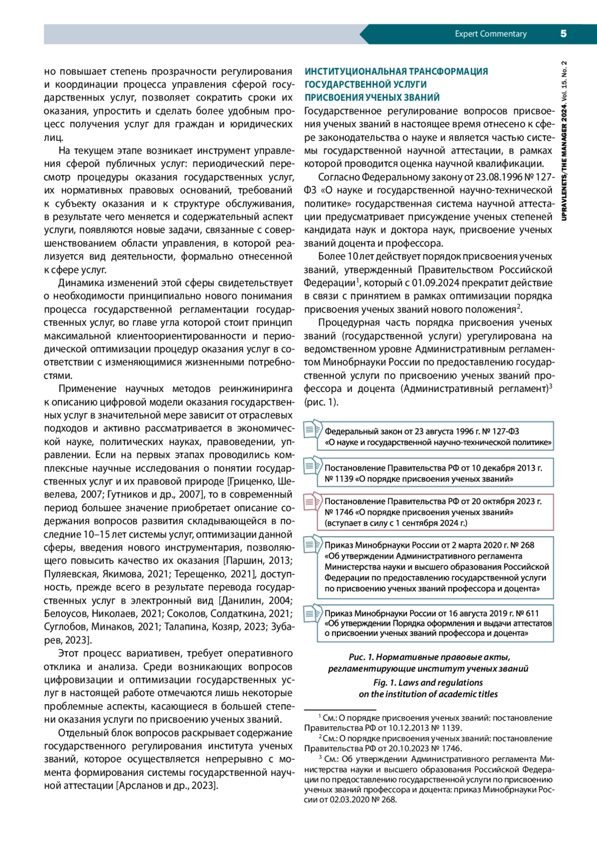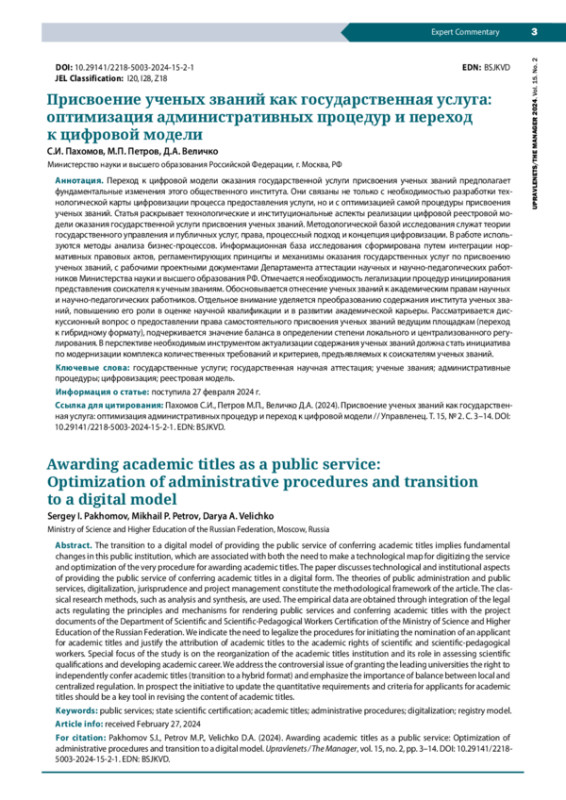 Переход к цифровой модели оказания государственной услуги присвоения ученых званий предполагает фундаментальные изменения этого общественного института. Они связаны не только с необходимостью разработки технологической карты цифровизации процесса предоставления услуги, но и с оптимизацией самой процедуры присвоения ученых званий. Статья раскрывает технологические и институциональные аспекты реализации цифровой реестровой модели оказания государственной услуги присвоения ученых званий. Методологической базой исследования служат теории государственного управления и публичных услуг, права, процессный подход и концепция цифровизации. В работе используются методы анализа бизнес-процессов. Информационная база исследования сформирована путем интеграции нормативных правовых актов, регламентирующих принципы и механизмы оказания государственных услуг по присвоению ученых званий, с рабочими проектными документами Департамента аттестации научных и научно-педагогических работников Министерства науки и высшего образования РФ. Отмечается необходимость легализации процедур инициирования представления соискателя к ученым званиям. Обосновывается отнесение ученых званий к академическим правам научных и научно-педагогических работников. Отдельное внимание уделяется преобразованию содержания института ученых званий, повышению его роли в оценке научной квалификации и в развитии академической карьеры. Рассматривается дискуссионный вопрос о предоставлении права самостоятельного присвоения ученых званий ведущим площадкам (переход к гибридному формату), подчеркивается значение баланса в определении степени локального и централизованного регулирования. В перспективе необходимым инструментом актуализации содержания ученых званий должна стать инициатива по модернизации комплекса количественных требований и критериев, предъявляемых к соискателям ученых званий.
