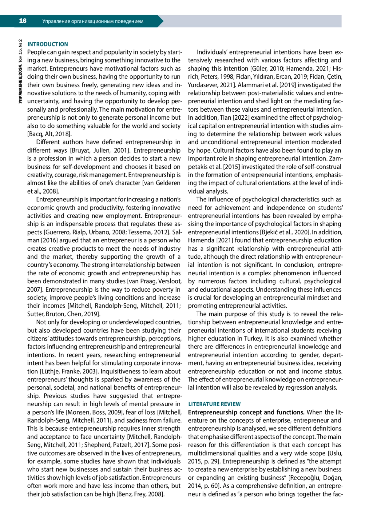 Концепция предпринимательских знаний и намерений ориентирована на изучение заинтересованности и способности индивида начать собственное дело. Культурные особенности – дополнительный фактор, который необходимо учитывать при оценке намерений человека стать предпринимателем. Статья посвящена анализу влияния уровня знаний в области предпринимательства на намерения иностранных студентов, обучающихся в Турции, заниматься бизнесом. Предпринята попытка установить зависимость между уровнем знаний о предпринимательстве и желанием начать собственное дело от различных характеристик студентов (пол, факультет, наличие бизнес-идеи и др.). Методологическую основу работы составили концепция предпринимательских знаний и намерений, теория запланированного поведения. Использовались методы частотного и регрессионного анализа, параметрические тесты, метод удобной выборки. Информационной базой послужили результаты опроса 380 иностранных студентов, обучающихся в 20 государственных и 5 частных университетах Турции в 2021–2022 учебном году. Опрос участников проводился с помощью социальных медиа и личных интервью. Результаты исследования свидетельствуют о статистически значимых различиях в предпринимательских знаниях и намерениях студентов в зависимости от наличия у них профильного образования, бизнесидеи, факультета обучения и ежемесячной суммы расходов. Обнаружено также, что приобретение специальных знаний и образования в сфере бизнеса оказывает существенное влияние на желание обучающихся стать предпринимателями. Результаты исследования представляют интерес для лиц, ответственных за составление учебных планов университетов, и способствуют более детальному пониманию и продвижению предпринимательских намерений иностранных студентов