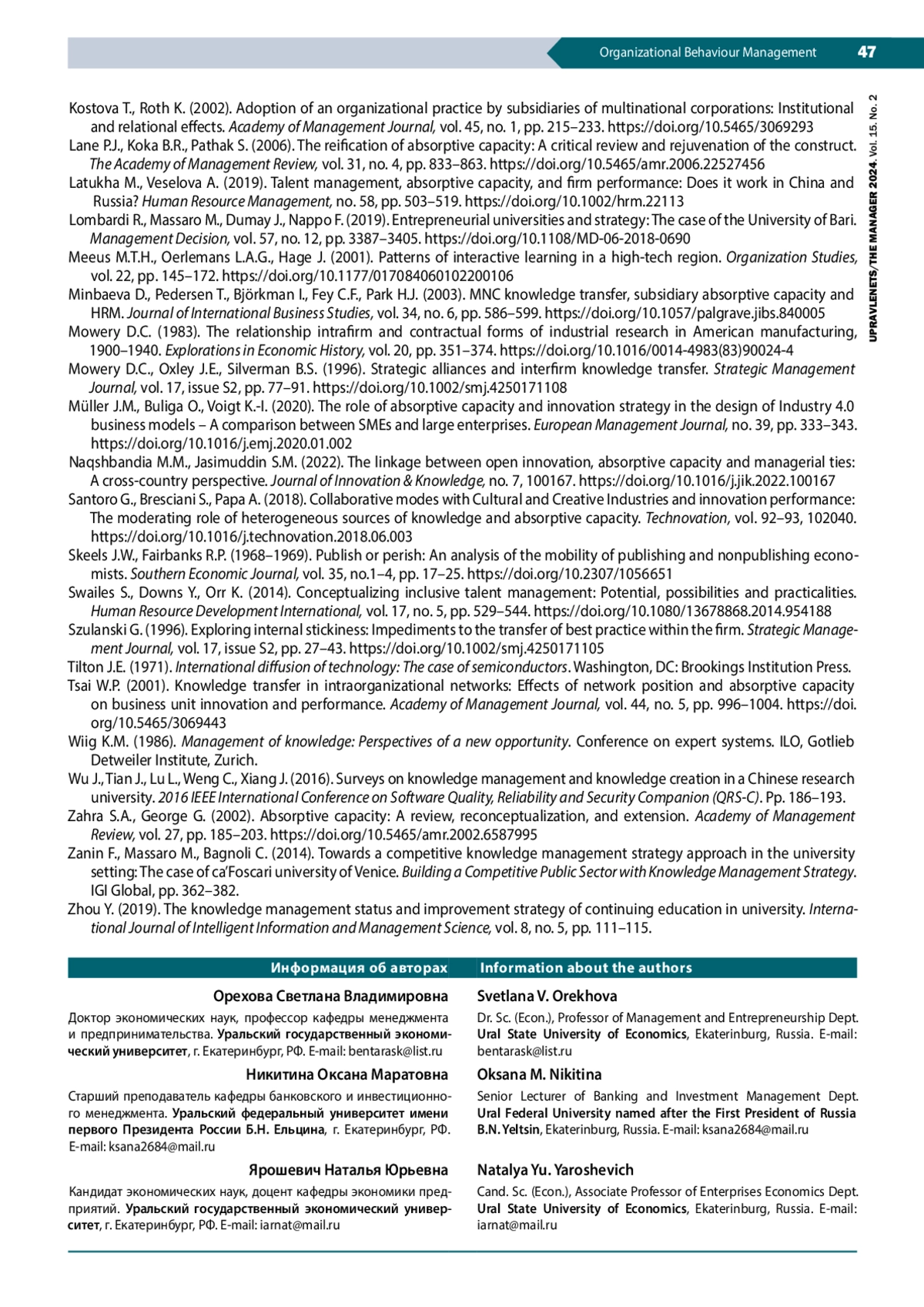 42. Zahra S.A., George G. (2002). Absorptive capacity: A review, reconceptualization, and extension. Academy of Management Review, vol. 27, рр. 185-203. DOI: 10.5465/amr.2002.6587995