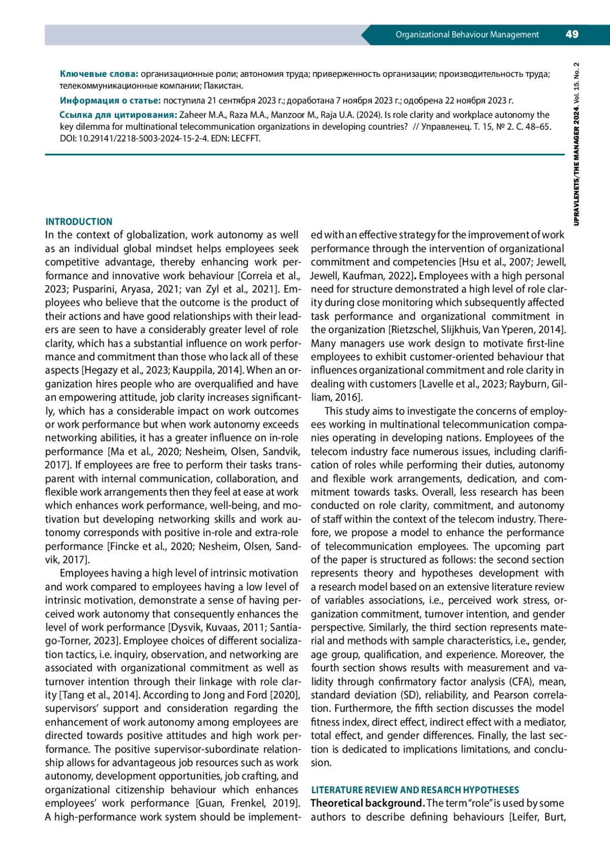 In the context of globalization, work autonomy as well as an individual global mindset helps employees seek competitive advantage, thereby enhancing work performance and innovative work behaviour [Correia et al., 2023; Pusparini, Aryasa, 2021; van Zyl et al., 2021]. Employees who believe that the outcome is the product of their actions and have good relationships with their leaders are seen to have a considerably greater level of role clarity, which has a substantial influence on work performance and commitment than those who lack all of these aspects [Hegazy et al., 2023; Kauppila, 2014].