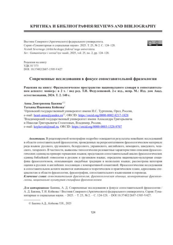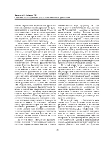 В рецензируемой монографии подробно освещаются результаты новейших исследований в области сопоставительной фразеологии, проведенных на репрезентативном фразеологическом материале ряда языков: русского, грузинского, белорусского, украинского, английского, немецкого, шведского, чешского, татарского. В частности, выявлены типологически релевантные характеристики описания фразеологических единиц на примере германских языков; представлен сопоставительный анализ фразеологических единиц библейской этимологии в русском и грузинском языках; определена национально-культурная специфика фразеологизмов, описывающих свадебные традиции в нескольких языках; рассмотрена категория оценки в русских и английских пословицах с компаративной семантикой. Фразеологические исследования в сопоставительном аспекте являются значимыми в теоретическом и практическом плане, адресованы специалистам в области фразеологии, фразеографии, сопоставительного языкознания и перевода.