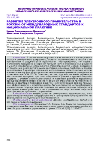 БАЛАШОВА И. В., ДЕРКАЧ А. А. РАЗВИТИЕ ЭЛЕКТРОННОГО ПРАВИТЕЛЬСТВА В РОССИИ: ОТ МЕЖДУНАРОДНЫХ СТАНДАРТОВ К НАЦИОНАЛЬНОЙ ПРАКТИКЕ // НАУЧНЫЙ ЖУРНАЛ "ГОСУДАРСТВЕННОЕ УПРАВЛЕНИЕ И ПРАВО". 2025. № 2 (6)
