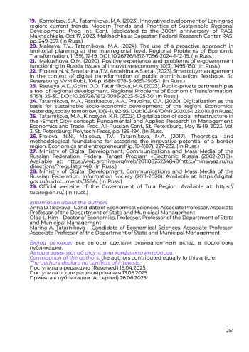 19. Комольцев С.А., Татарникова М.А. Инновационное развитие Ленинградской области: современные тенденции // Современные тренды и приоритеты устойчивого развития регионов: Материалы международной научно-практической конференции, посвящённой 300-летию Российской академии наук, Махачкала, 17 октября 2023 года. Махачкала: Дагестанский федеральный исследовательский центр РАН, 2023. С. 249-257.
