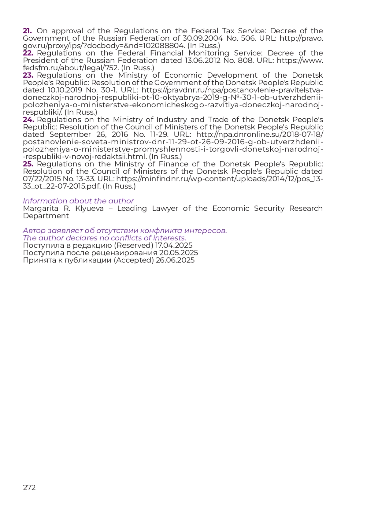23. Положение о Министерстве экономического развития Донецкой Народной Республики: Постановление Правительства Донецкой Народной Республики от 10.10.2019 г. № 30-1. URL: https://pravdnr.ru/npa/postanovlenie-pravitelstva-doneczkoj-narodnoj-respubliki-ot-10-oktyabrya-2019-g-№-30-1-ob-utverzhdenii-polozheniya-o-ministerstve-ekonomicheskogo-razvitiya-doneczkoj-narodnoj-respubliki/.
