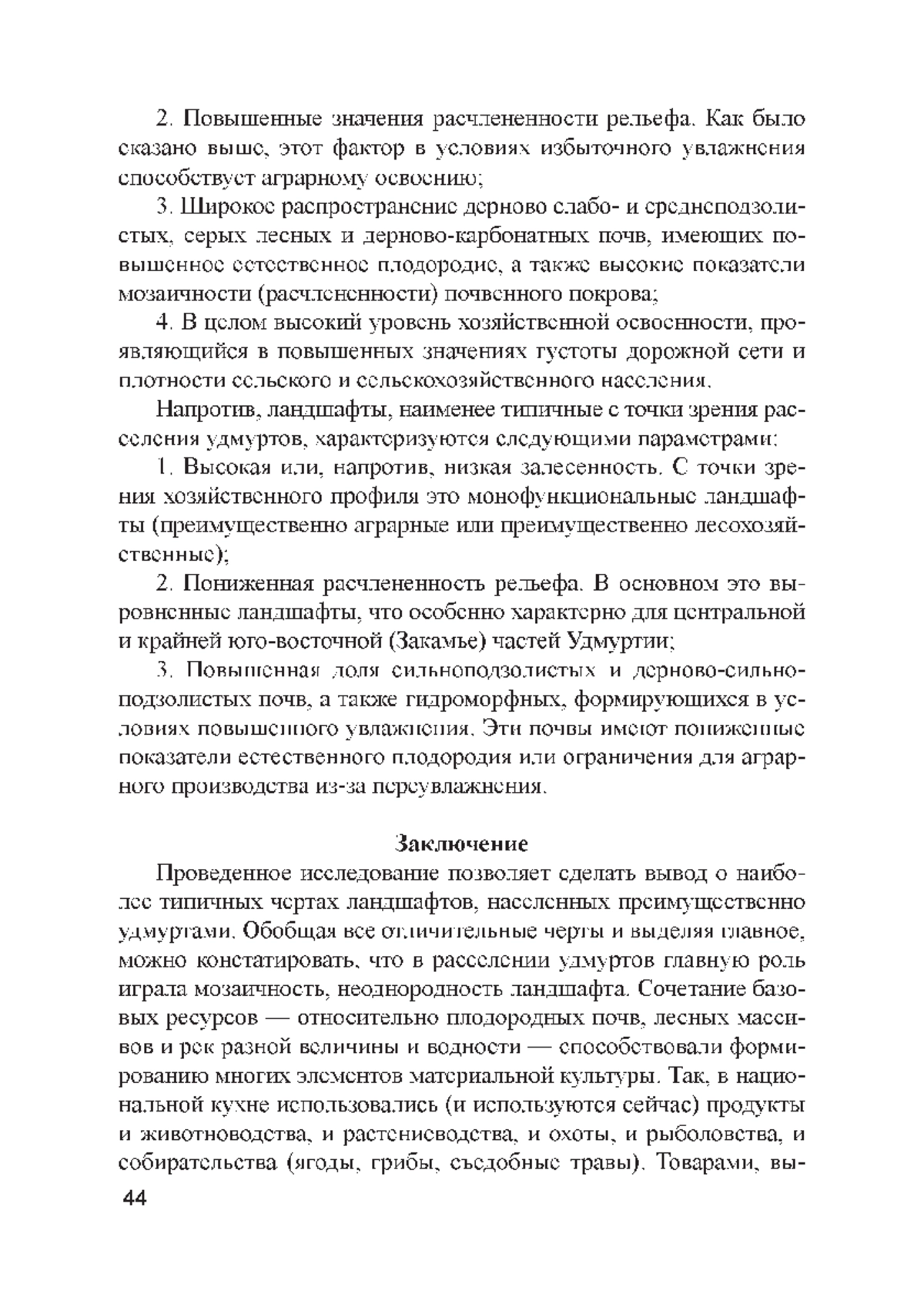 Цель статьи — проанализировать важнейшие характеристики природных ландшафтов, в пределах которых проживает основная часть удмуртского этноса. Предлагается и реализуется методика определения ландшафтов, типичных для расселения удмуртов. Результаты. Выявлено, что основным при расселении удмуртов была пригодность природного ландшафта для аграрной деятельности. Однако в процессе хозяйственного освоения из-за сложного рельефа территории и невысокого естественного плодородия почв высокая ландшафтная мозаичность стала важнейшим фактором, повлиявшим на формирование основных черт материальной культуры удмуртов. В целом, повышенное ресурсное разнообразие таких ландшафтов стало основой экономической и метеорологической устойчивости традиционного хозяйства удмуртов.