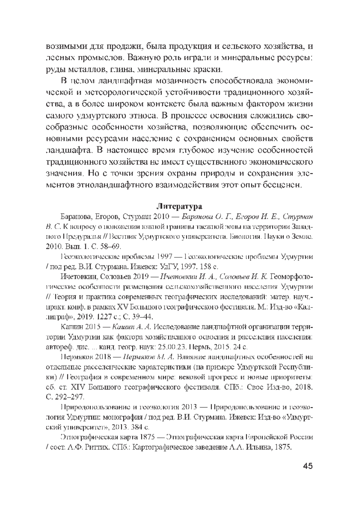 1. Баранова О. Г., Егоров И. Е., Стурман В. С. К вопросу о положении южной границы таежной зоны на территории Западного Предуралья // Вестник Удмуртского университета. Биология. Науки о Земле. 2010. Вып. 1. С. 58-69.