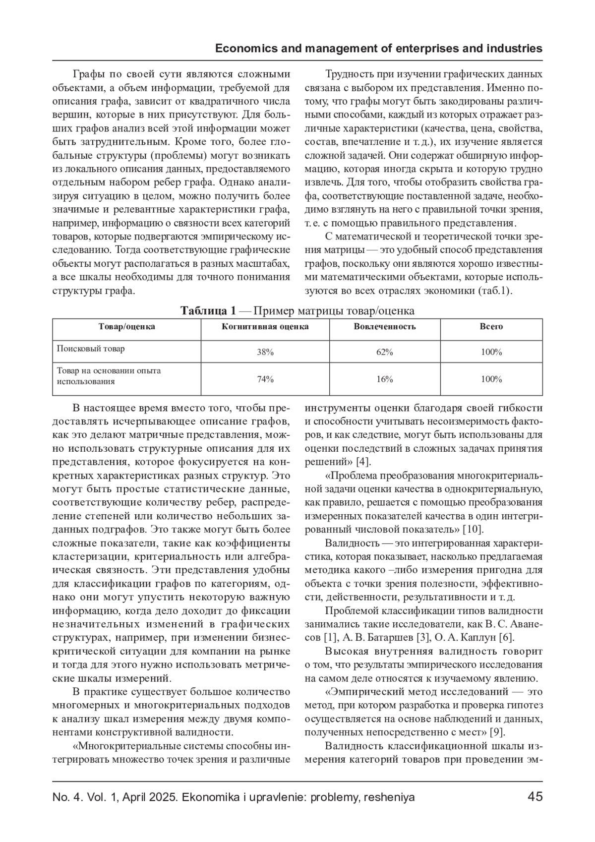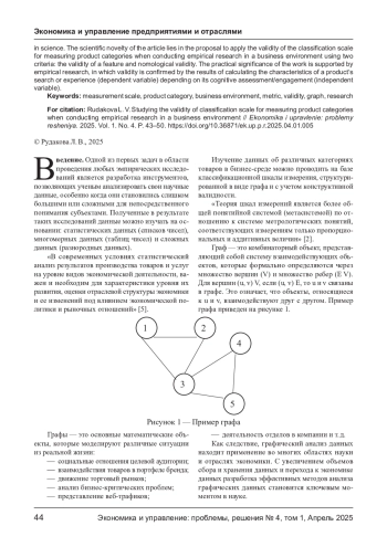 В статье проведено изучение данных о различных категориях товаров в бизнес-среде на основании классификационной шкалы измерения структурированной в виде графа и с учетом конструктивной валидности. Выявлено, что с увеличением объемов сбора и хранения информации и перехода к экономике данных, разработка эффективных методов анализа графических данных становится ключевым моментом в науке. Научная новизна статьи заключается в предложении применения валидности классификационной шкалы измерения категорий товаров при проведении эмпирических исследований в бизнес-среде со стороны двух критериев: валидности какого-либо признака и номологической валидности. Практическая значимость работы подкрепляется эмпирическим исследованием, при котором валидность подтверждена результатами расчета характеристик поиска или опыта товара (зависимая переменная) в зависимости от его когнитивной оценки/вовлеченности (независимая переменная).