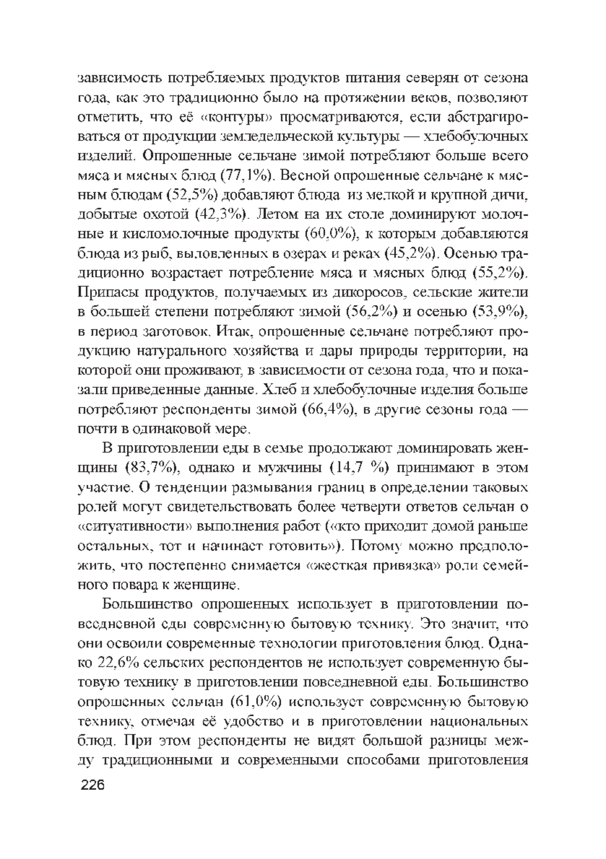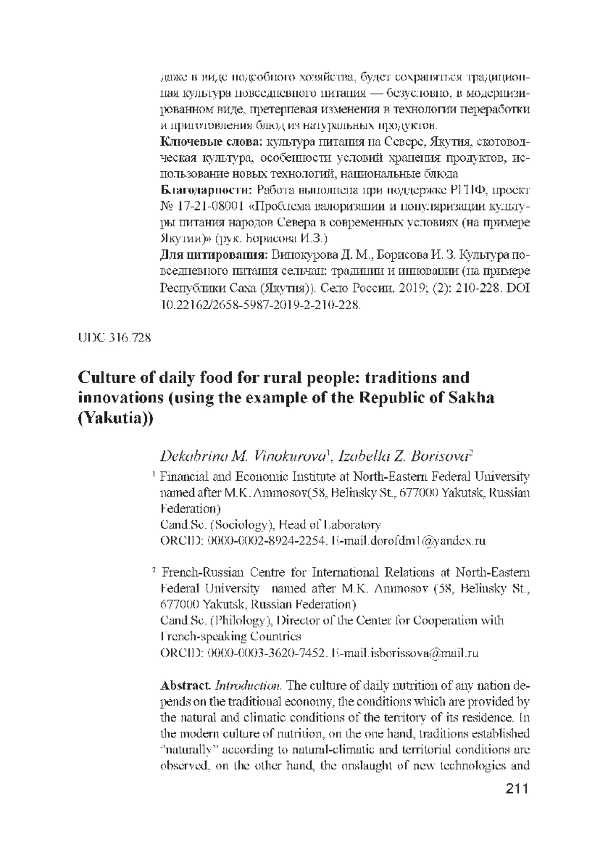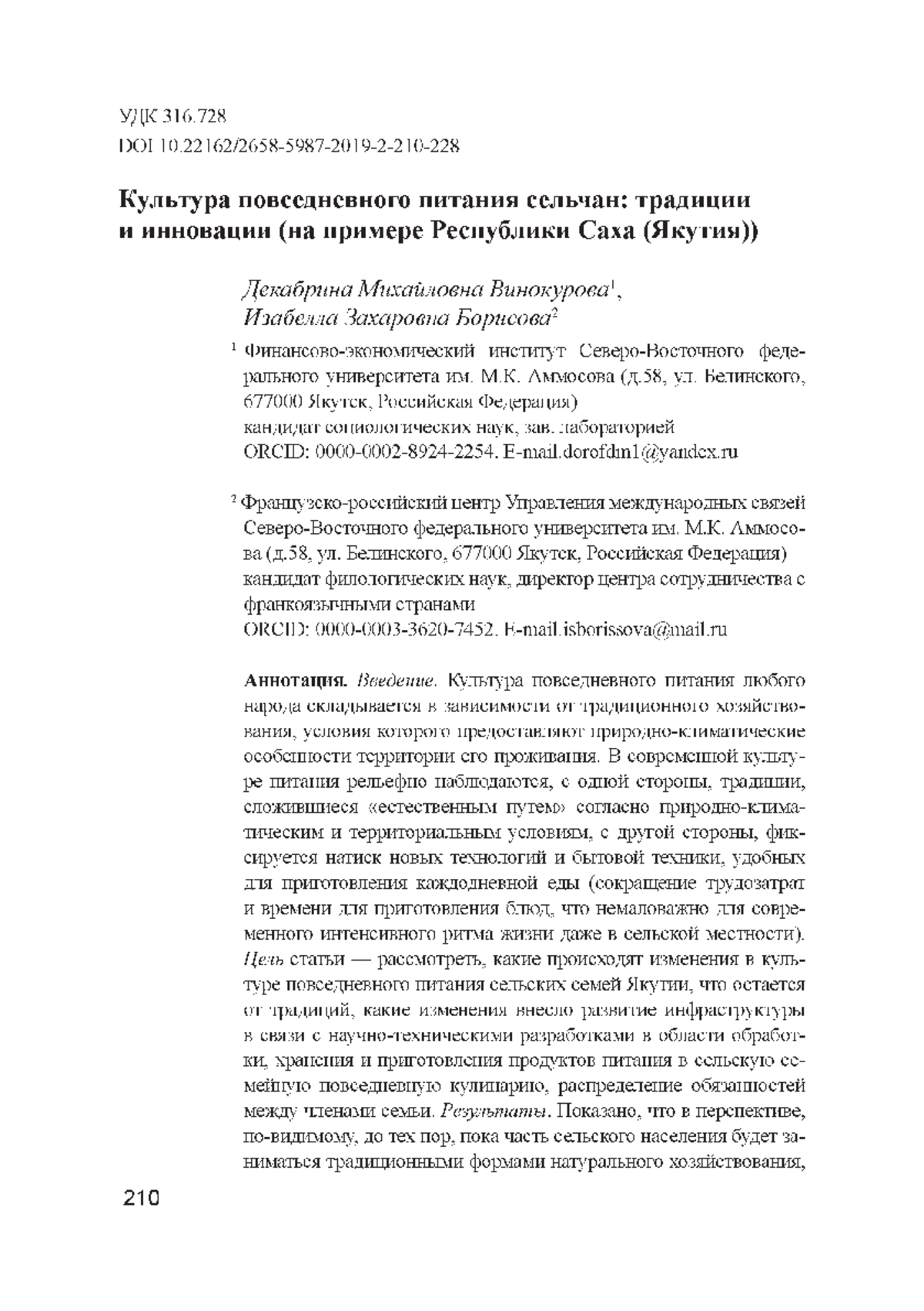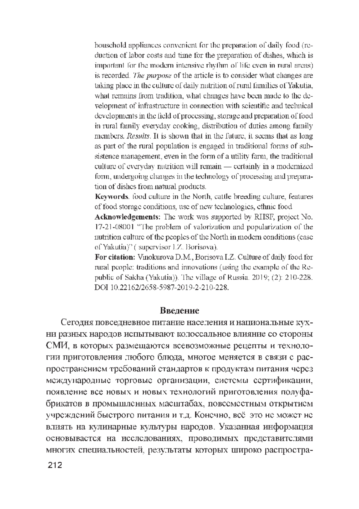 Введение. Культура повседневного питания любого народа складывается в зависимости от традиционного хозяйствования, условия которого предоставляют природно-климатические особенности территории его проживания. В современной культуре питания рельефно наблюдаются, с одной стороны, традиции, сложившиеся «естественным путем» согласно природно-климатическим и территориальным условиям, с другой стороны, фиксируется натиск новых технологий и бытовой техники, удобных для приготовления каждодневной еды (сокращение трудозатрат и времени для приготовления блюд, что немаловажно для современного интенсивного ритма жизни даже в сельской местности). Цель статьи — рассмотреть, какие происходят изменения в культуре повседневного питания сельских семей Якутии, что остается от традиций, какие изменения внесло развитие инфраструктуры в связи с научно-техническими разработками в области обработки, хранения и приготовления продуктов питания в сельскую семейную повседневную кулинарию, распределение обязанностей между членами семьи. Результаты. Показано, что в перспективе, по-видимому, до тех пор, пока часть сельского населения будет заниматься традиционными формами натурального хозяйствования, даже в виде подсобного хозяйства, будет сохраняться традиционная культура повседневного питания — безусловно, в модернизированном виде, претерпевая изменения в технологии переработки и приготовления блюд из натуральных продуктов.