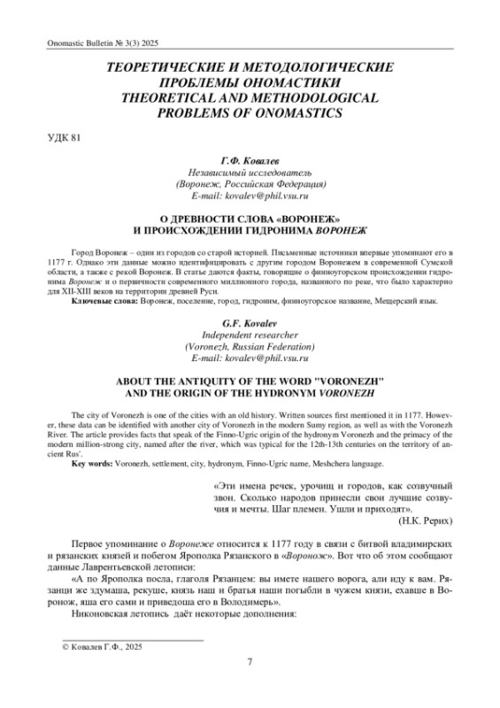 Город Воронеж – один из городов со старой историей. Письменные источники впервые упоминают его в 1177 г. Однако эти данные можно идентифицировать с другим городом Воронежем в современной Сумской области, а также с рекой Воронеж. В статье даются факты, говорящие о финноугорском происхождении гидронима Воронеж и о первичности современного миллионного города, названного по реке, что было характерно для ХII-XIII веков на территории древней Руси.