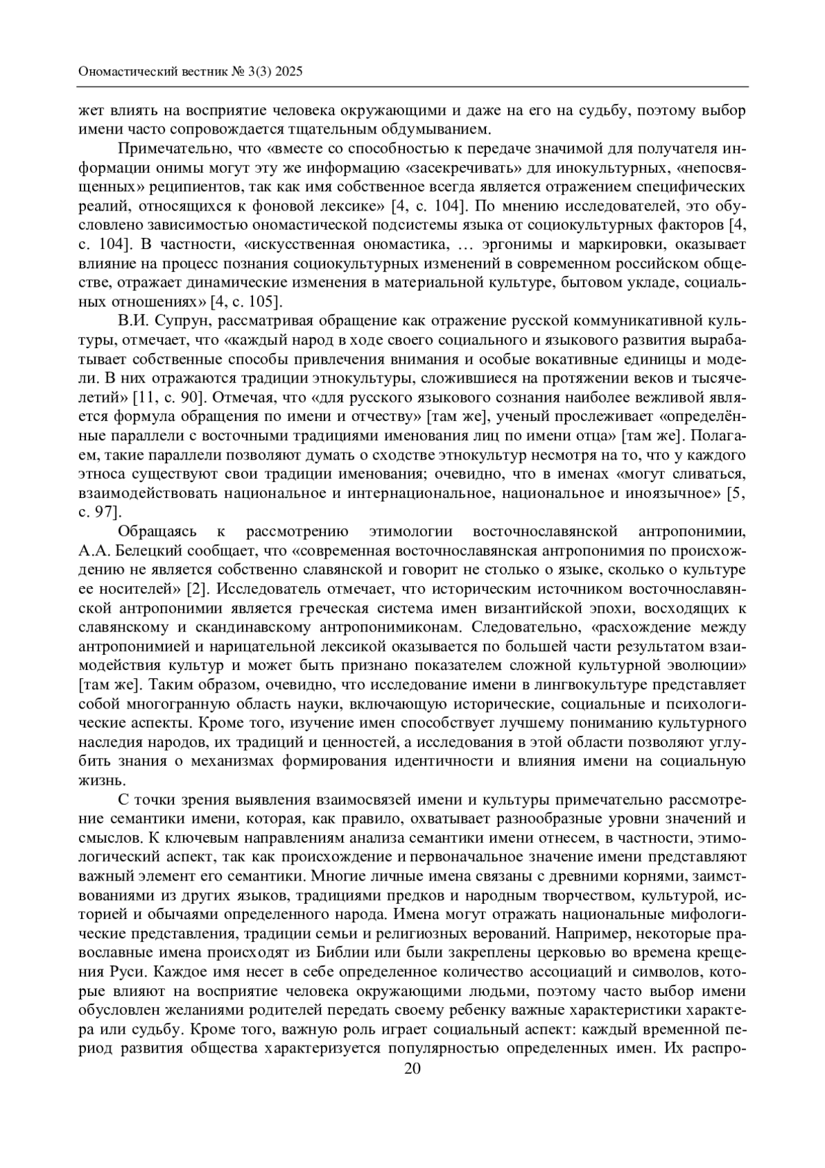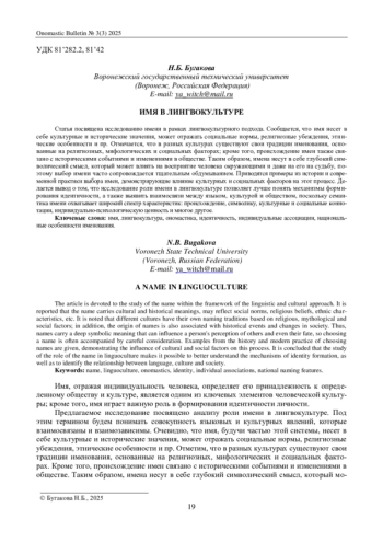 Статья посвящена исследованию имени в рамках лингвокультурного подхода. Сообщается, что имя несет в себе культурные и исторические значения, может отражать социальные нормы, религиозные убеждения, этнические особенности и пр. Отмечается, что в разных культурах существуют свои традиции именования, основанные на религиозных, мифологических и социальных факторах; кроме того, происхождение имен также связано с историческими событиями и изменениями в обществе. Таким образом, имена несут в себе глубокий символический смысл, который может влиять на восприятие человека окружающими и даже на его на судьбу, по-этому выбор имени часто сопровождается тщательным обдумыванием. Приводятся примеры из истории и современной практики выбора имен, демонстрирующие влияние культурных и социальных факторов на этот процесс. Делается вывод о том, что исследование роли имени в лингвокультуре позволяет лучше понять механизмы формирования идентичности, а также выявить взаимосвязи между языком, культурой и обществом, поскольку семантика имени охватывает широкий спектр характеристик: происхождение, символику, культурные и социальные конно-тации, индивидуально-психологическую ценность и многое другое.
