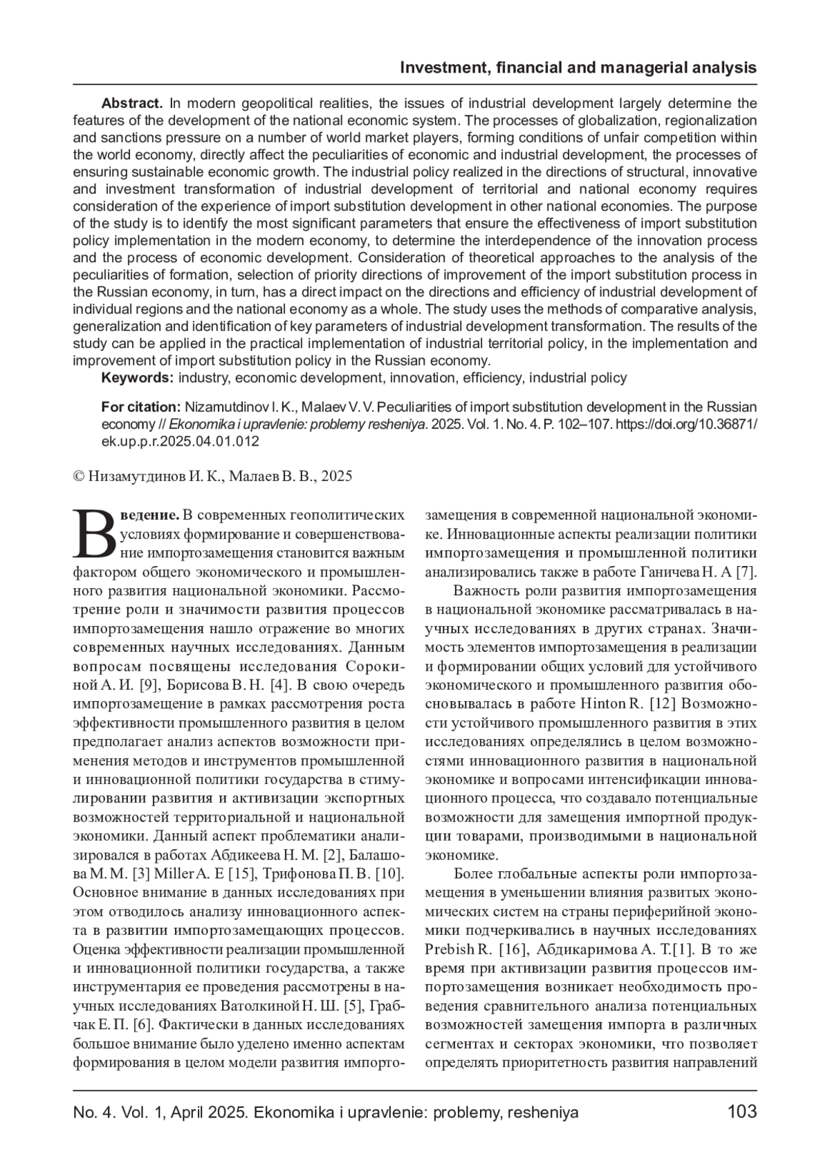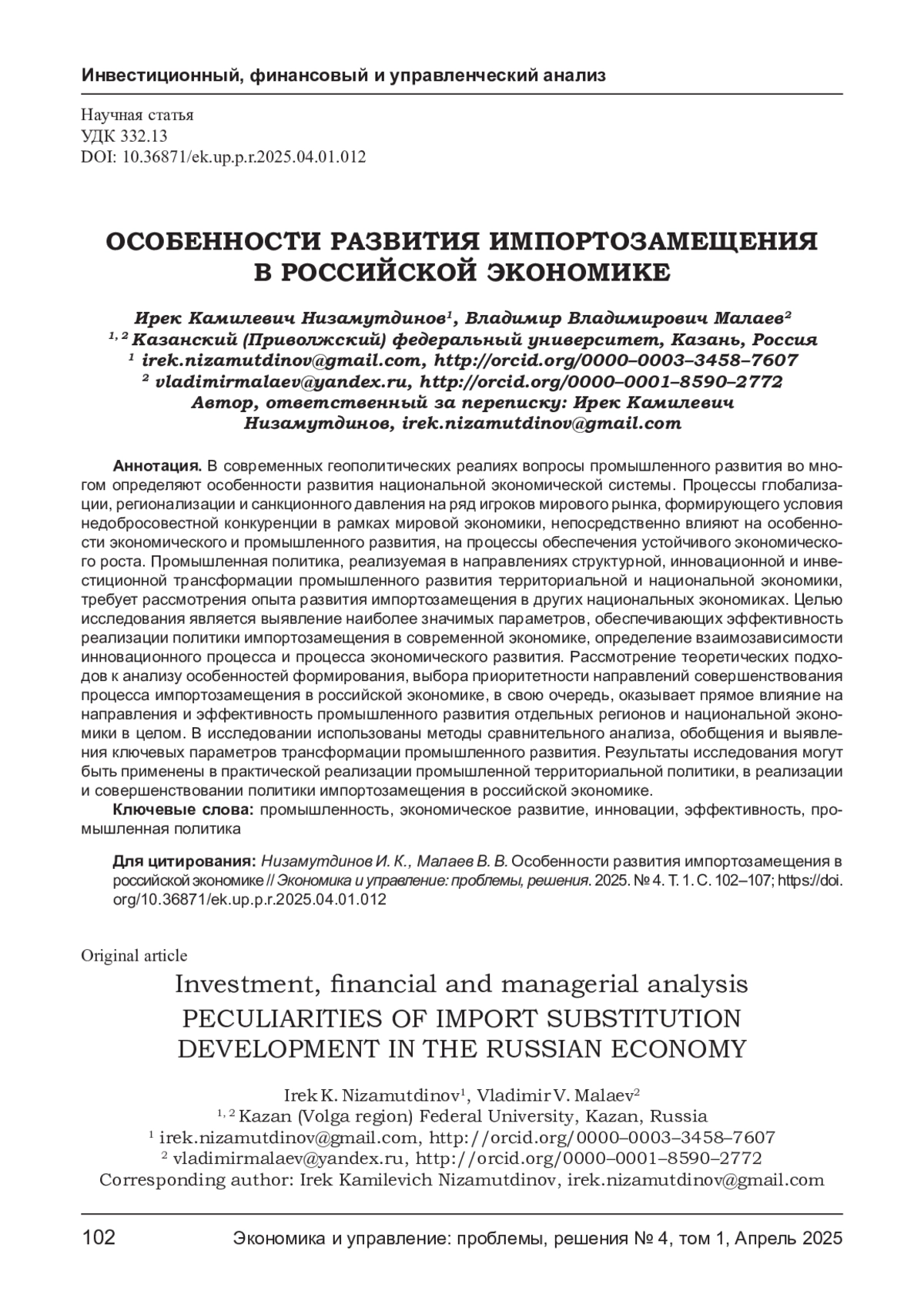 В современных геополитических условиях формирование и совершенствование импортозамещения становится важным фактором общего экономического и промышленного развития национальной экономики.