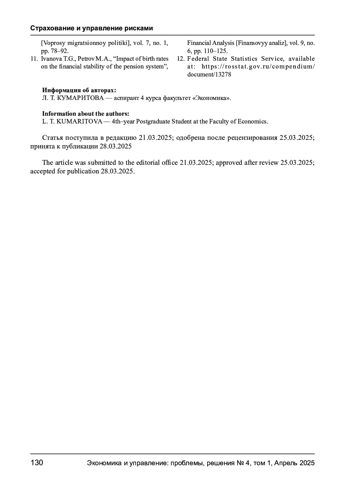 11. Иванова Т. Г., Петров М. А. Влияние уровня рождаемости на финансовую устойчивость пенсионной системы // Финансовый анализ. - 2022. - Т. 9, № 6. - С. 110-125.