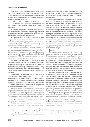 1. Бойкова М. В., Макрусев В. В., Нови- система: концептуальные идеи и проблемы исков В. Е. Сфера государственных таможенных следования // Экономический анализ: теория услуг как сервисная экономико- управленческая и практика. - 2024. - Т. 23, № 2 (545). - С. 263-283.