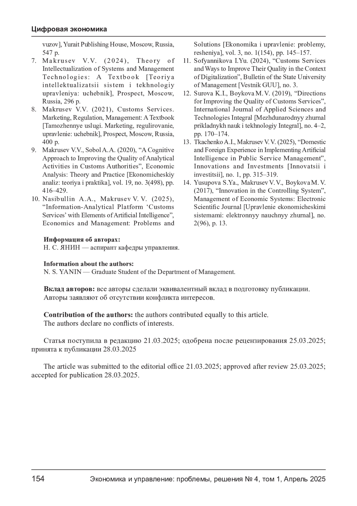 10. Насибуллин А. А., Макрусев В. В. Информационно-аналитическая платформа “Таможенные услуги” с элементами искусственного интеллекта // Экономика и управление: проблемы, решения. - 2025. - Т. 3, № 1 (154). - С. 145-157. EDN: OGQCAC