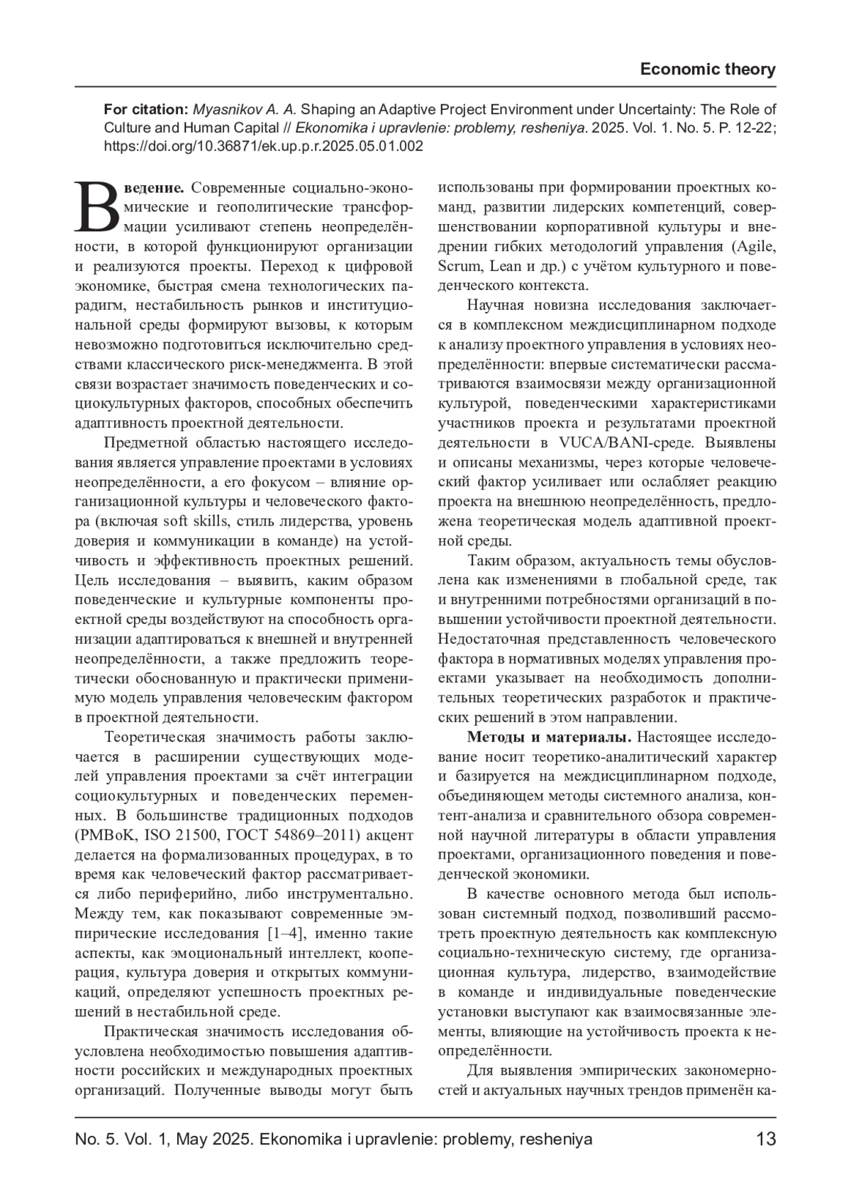 Статья посвящена влиянию организационной культуры и человеческого фактора на адаптивность проектного управления в условиях неопределённости. На основе анализа исследований 2020-2024 гг. показано, что soft skills, лидерство, доверие и коммуникация усиливают устойчивость проектов. Подчёркивается, что без учёта культурных и поведенческих аспектов технические подходы теряют эффективность. Предложена модель интеграции человеческого фактора для повышения гибкости и результативности проектной деятельности.