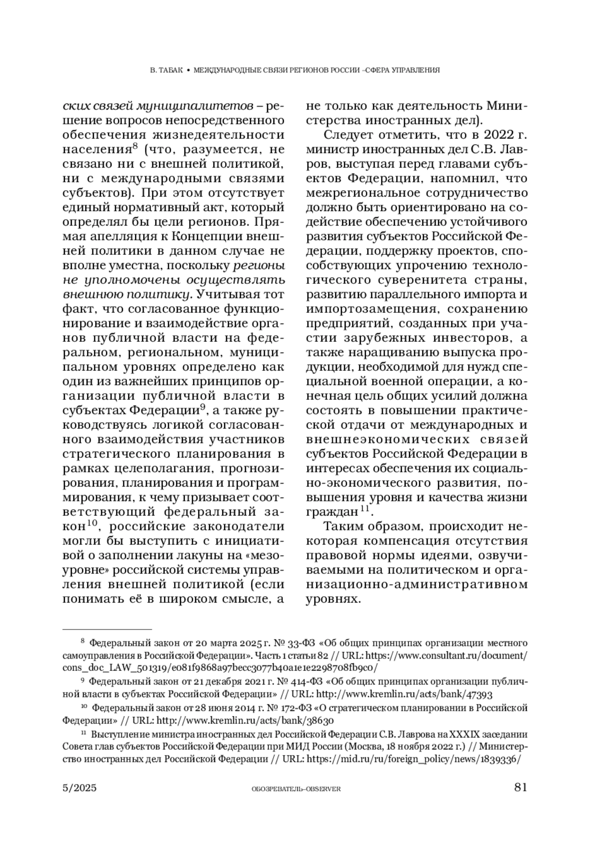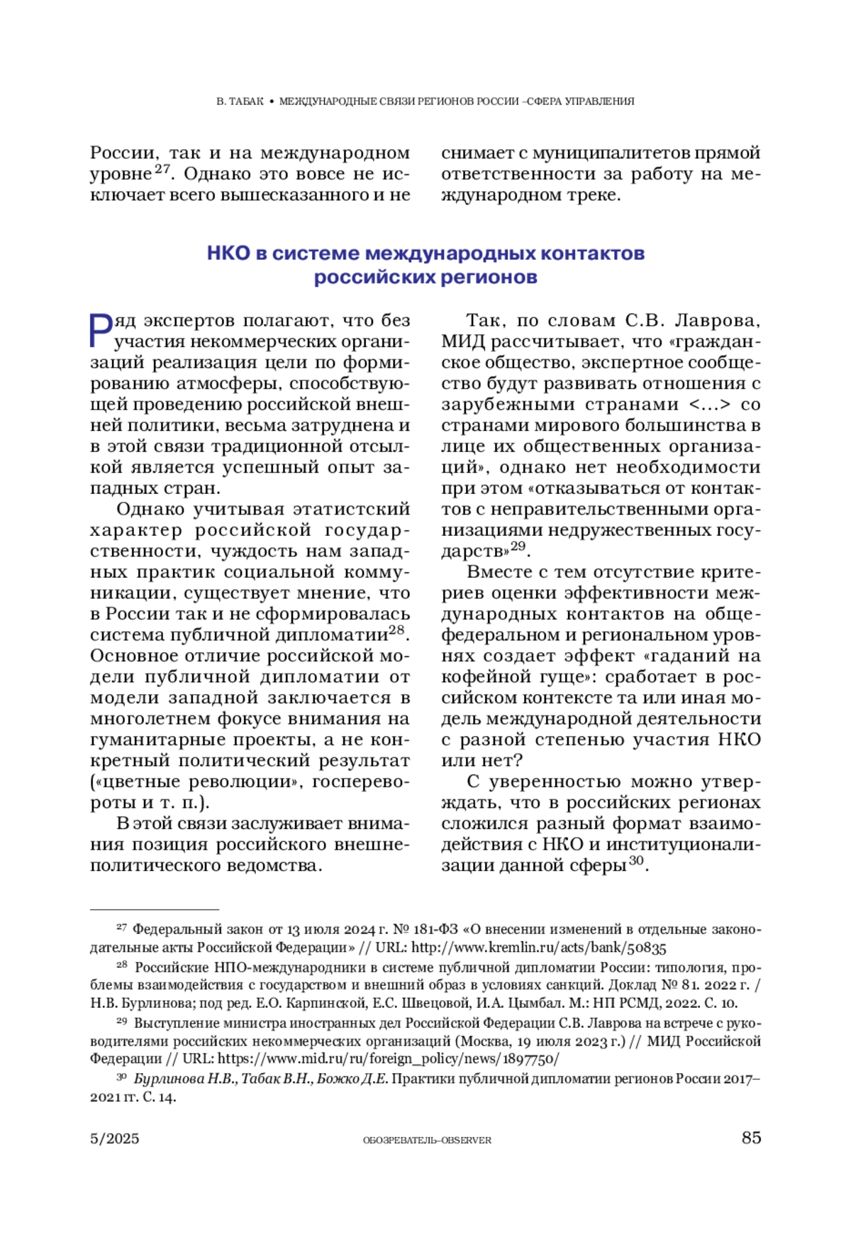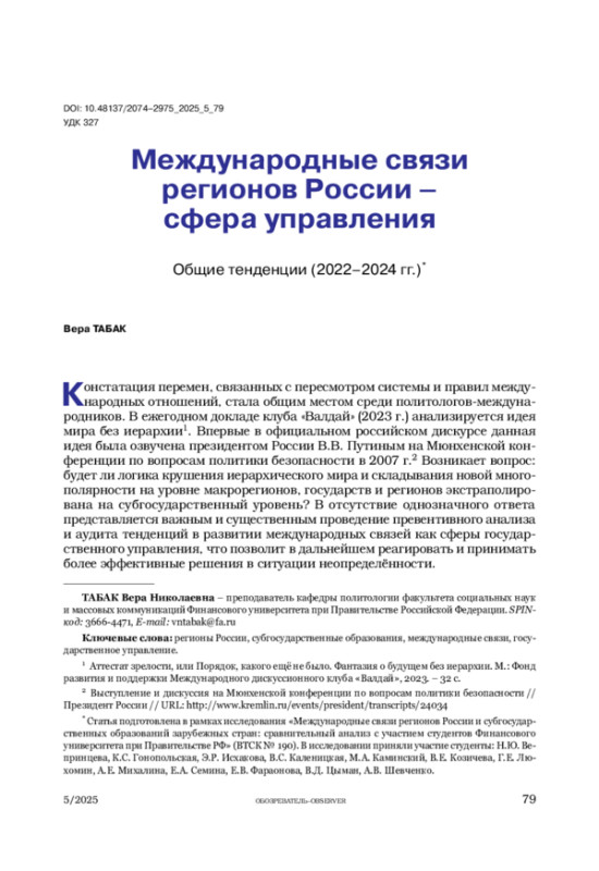 ТАБАК В. Н. МЕЖДУНАРОДНЫЕ СВЯЗИ РЕГИОНОВ РОССИИ – СФЕРА УПРАВЛЕНИЯ. ОБЩИЕ ТЕНДЕНЦИИ (2022–2024 ГГ.) // ОБОЗРЕВАТЕЛЬ. 2025. № 5