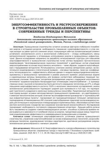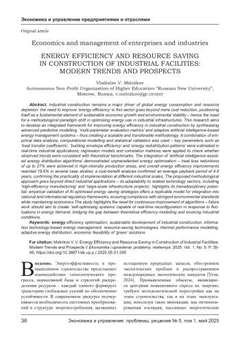 Промышленное строительство остается основным фактором глобального потребления энергии и истощения ресурсов: необходимость повышения «энергоэффективности» в этом секторе выходит за рамки простого снижения затрат, позиционируя себя как основополагающий элемент устойчивого экономического роста и экологической стабильности - отсюда необходимость смены методологической парадигмы в оптимизации использования энергии в промышленных инфраструктурах. Данное исследование направлено на разработку интегрированной структуры для повышения энергоэффективности в промышленном строительстве путем синтеза передового прогностического моделирования, “многопараметрических оценочных показателей” и адаптивных систем управления энергопотреблением на основе искусственного интеллекта - таким образом, создается масштабируемая и передаваемая методология. Использовалось сочетание анализа эмпирических данных, вычислительного моделирования и статистической проверки - ключевые параметры, такие как «коэффициенты теплопроводности», «эффективность оболочки здания» и «модели перераспределения энергии», оценивались в промышленных приложениях в режиме реального времени; регрессионные модели и корреляционные матрицы применялись для проверки соответствия наблюдаемых тенденций теоретическим эталонам. Интеграция “алгоритмов распределения энергии с поддержкой искусственного интеллекта” продемонстрировала беспрецедентную оптимизацию энергопотребления - в производственных зонах с высокой интенсивностью было достигнуто сокращение теплопотерь до 27%, а общее повышение энергоэффективности достигло 19,6% в нескольких тематических исследованиях; анализ экономической целесообразности подтвердил средний срок окупаемости в 4,8 года, что подтверждает практичность внедрения в различных промышленных масштабах. Предложенный методологический подход выходит за рамки непосредственного промышленного применения - его адаптируемость к смежным технологическим секторам, включая “высокоэффективное производство” и “крупномасштабные инфраструктурные проекты”, подчеркивает его трансдисциплинарный потенциал; эмпирическое подтверждение оптимизированных ИИ стратегий энергосбережения предлагает воспроизводимую модель для интеграции в национальные и международные нормативные базы, обеспечивая соответствие жестким экологическим стандартам при сохранении экономической жизнеспособности. Исследование подчеркивает необходимость постоянного совершенствования алгоритмов - будущая работа должна быть направлена на создание «самооптимизирующихся систем», способных в реальном времени перестраиваться в зависимости от колебаний спроса на энергию, преодолевая разрыв между теоретическим моделированием эффективности и развивающимися промышленными условиями.
