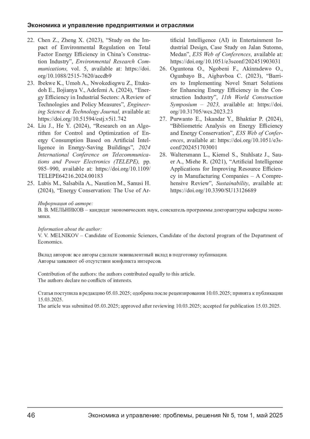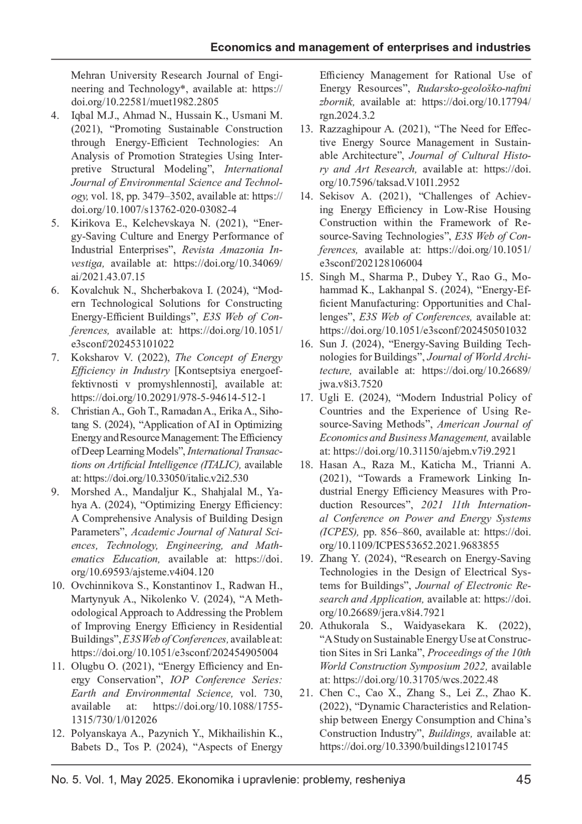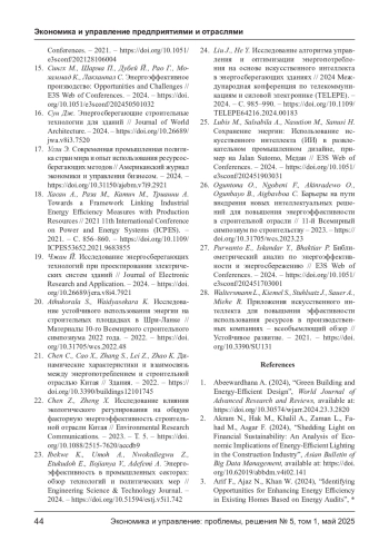 22. Chen Z., Zheng X. Исследование влияния экологического регулирования на общую факторную энергоэффективность строительной отрасли Китая // Environmental Research Communications. - 2023. - Т. 5. -. DOI: 10.1088/2515-7620/accdb9