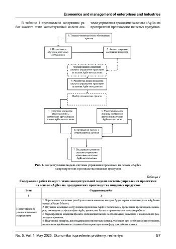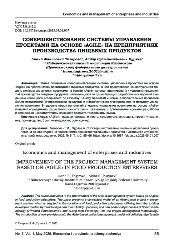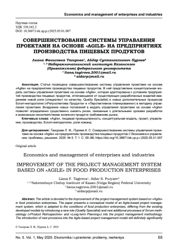 Статья посвящена совершенствованию системы управления проектами на основе «Agile» на предприятиях производства пищевых продуктов. В ней представлена концептуальная модель системы управления проектами на основе «Agile», которая адаптирована к условиям предприятий производства пищевых продуктов, отличающаяся от существующих разработанных моделей введением новой роли (специалист по качеству; Quality Specialist) и новых дополнительных процессов Scrum-методологии («Ретроспектива Продукта» и «Перспективное планирование») в методику управления проектами. Внедрение новых положений в модель управления проектами на основе «Agile» позволит определенно существенно снизить риски, связанные с длительными сроками разработки и возможным несоответствием конечного продукта требованиям рынка.