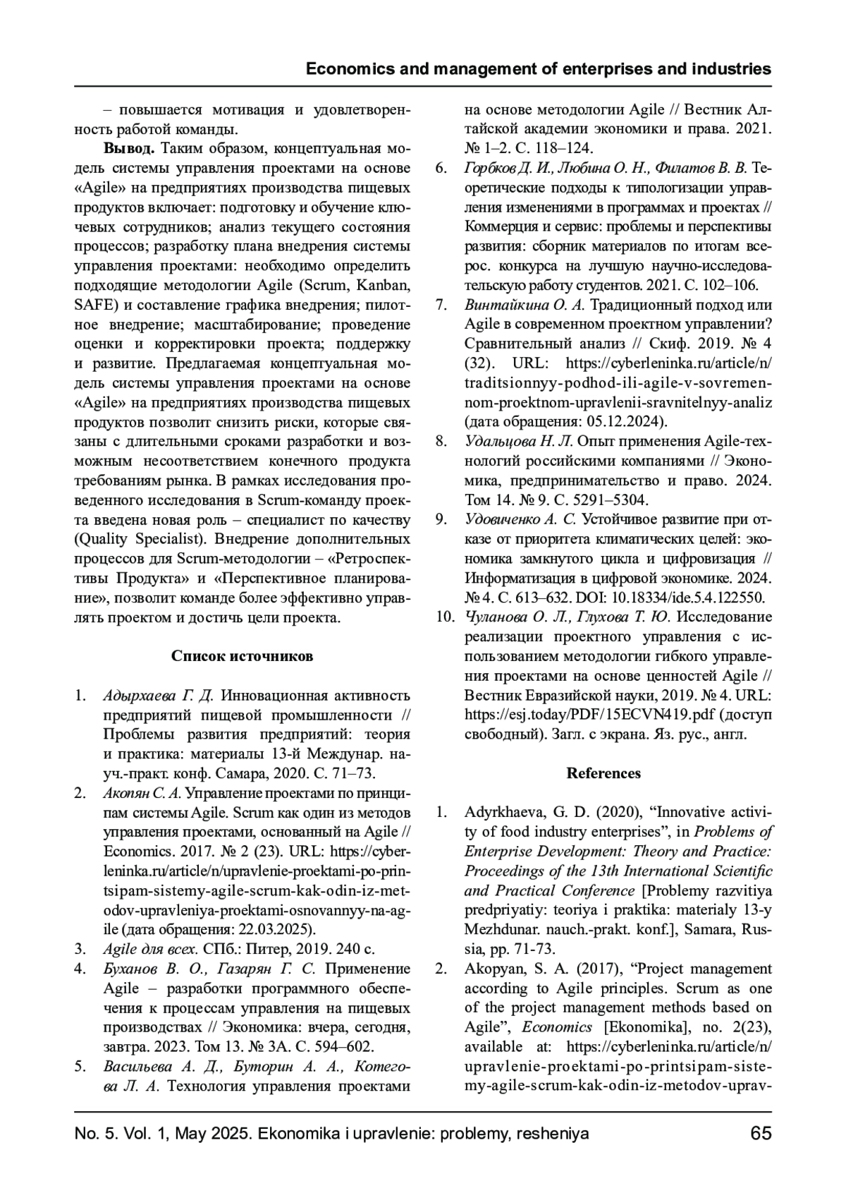 10. Чуланова О. Л., Глухова Т. Ю. Исследование реализации проектного управления с использованием методологии гибкого управления проектами на основе ценностей Agile // Вестник Евразийской науки, 2019. № 4. URL: https://esj.today/PDF/15ECVN419.pdf (доступ свободный). Загл. с экрана. Яз. рус., англ.