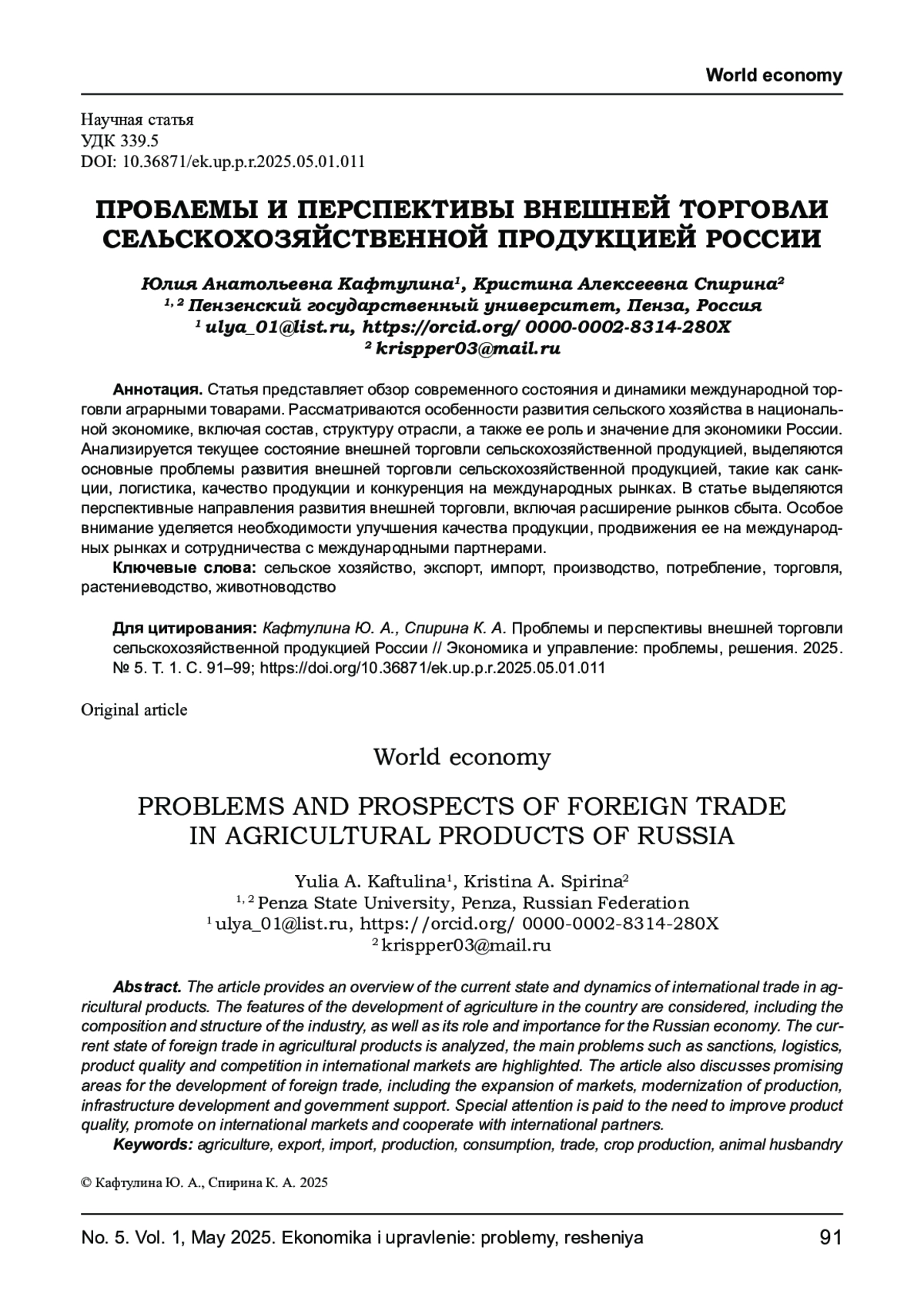Статья представляет обзор современного состояния и динамики международной торговли аграрными товарами. Рассматриваются особенности развития сельского хозяйства в национальной экономике, включая состав, структуру отрасли, а также ее роль и значение для экономики России. Анализируется текущее состояние внешней торговли сельскохозяйственной продукцией, выделяются основные проблемы развития внешней торговли сельскохозяйственной продукцией, такие как санкции, логистика, качество продукции и конкуренция на международных рынках. В статье выделяются перспективные направления развития внешней торговли, включая расширение рынков сбыта. Особое внимание уделяется необходимости улучшения качества продукции, продвижения ее на международных рынках и сотрудничества с международными партнерами.