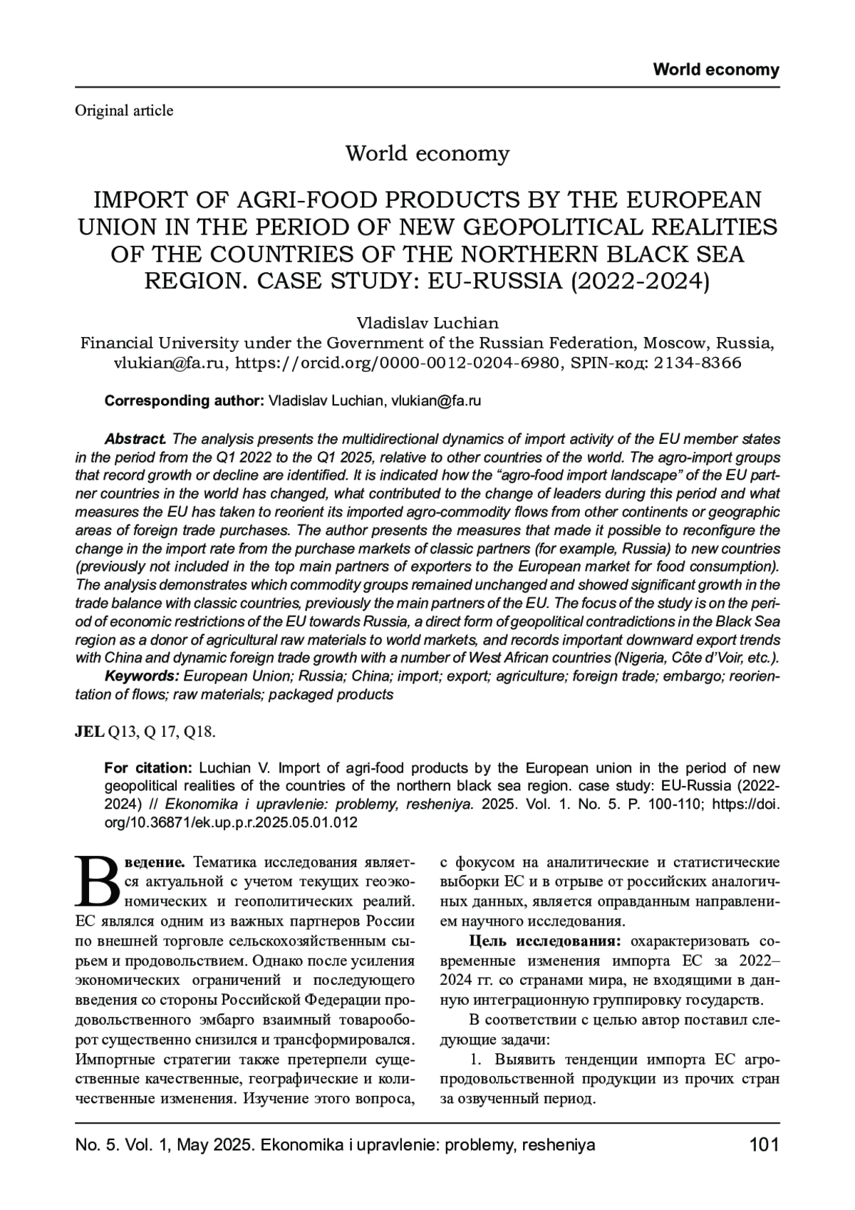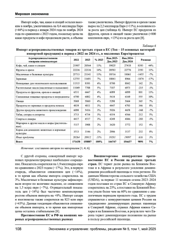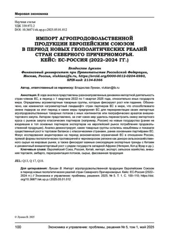 В ходе анализа представлены разнонаправленные динамики импортной деятельность стран-членов ЕС, в период с 1 квартала 2022 по 1 квартал 2025 года, относительно иных государств мира. Определены агроимпортные товарные группы, которые фиксируют рост или падение. Обозначено, как изменился «агроимпортный ландшафт» стран партнеров ЕС в мире, что способствовало смене лидеров за этот период и какие меры предпринял ЕС для переориентации своих импортных агропродовольственных товарных потоков с иных континентов или географических ареалов внешнеторгового закупа. Автором представлено, за счет каких мер удалось перенастроить смену импортного курса с рынков закупа классических партнеров (например, России) на новые государства (ранее не входившие в топ основных партнеров экспортеров на европейский рынок потребления продовольственной продукции). Анализ демонстрирует, какие товарные группы остались незыблемы и показали существенный рост в торговом балансе с классическими странами, ранее основными партнёрами ЕС. Фокус исследования акцентирован на период экономических ограничений ЕС в отношении России, прямой формы геополитических противоречий в черноморском регионе как доноре сельскохозяйственного сырья на мировые рынки, а также фиксирует важные снисходящие экспортные тренды с Китаем и динамичный внешнеторговый рост с рядом государств западной Африки (Нигерия, Кот-д`Вуар и др.).