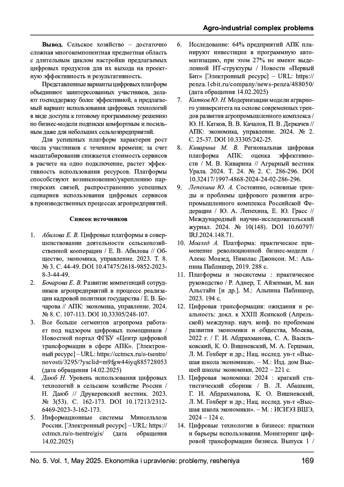 1. Абилова Е. В. Цифровые платформы в совершенствовании деятельности сельскохозяйственной кооперации / Е. В. Абилова // Общество, экономика, управление. 2023. Т. 8. № 3. С. 44-49. DOI: 10.47475/2618-9852-20238-3-44-49 EDN: ALGVVA
