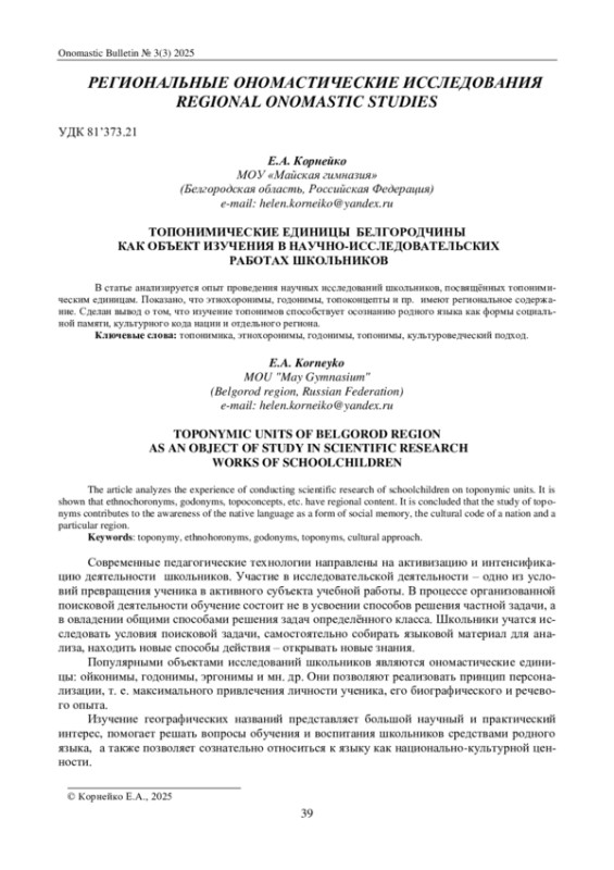 В статье анализируется опыт проведения научных исследований школьников, посвящённых топонимическим единицам. Показано, что этнохоронимы, годонимы, топоконцепты и пр. имеют региональное содержание. Сделан вывод о том, что изучение топонимов способствует осознанию родного языка как формы социальной памяти, культурного кода нации и отдельного региона.