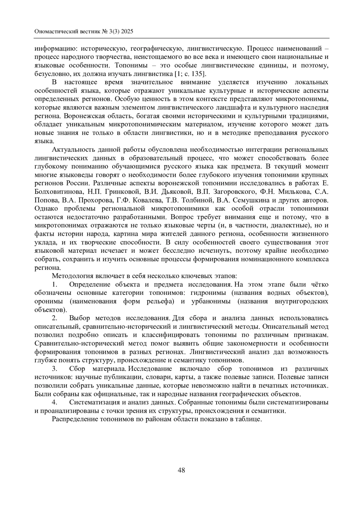 Цель настоящей статьи – изучение официальных и неофициальных микротопонимов, составляющих специфическую часть лексики Воронежской области. Топонимы – это особые лингвистические единицы, и поэтому, безусловно, их должна изучать лингвистика. Микротопонимы – один из видов топонимов, название небольшого местного объекта. В ходе исследования была выявлена специфика использования микротопонимов в Верхнемамонском и Россошанском районах. В ходе сопоставительного анализа на качественном уровне проведена корреляция между уровнями топонимизации и классификацией геоморфологических объектов, определены критерии микротопонимов. В настоящее время значительное внимание уделяется изучению локальных особенностей языка, которые отражают уникальные культурные и исторические аспекты определенных регионов. Особую ценность в этом контексте представляют микротопонимы, которые являются важным элементом лингвистического ландшафта и культурного наследия региона. Воронежская область, богатая своими историческими и культурными традициями, обладает уникальным микротопонимическим материалом, изучение которого может дать новые знания не только в области лингвистики, но и в методике преподавания русского языка.