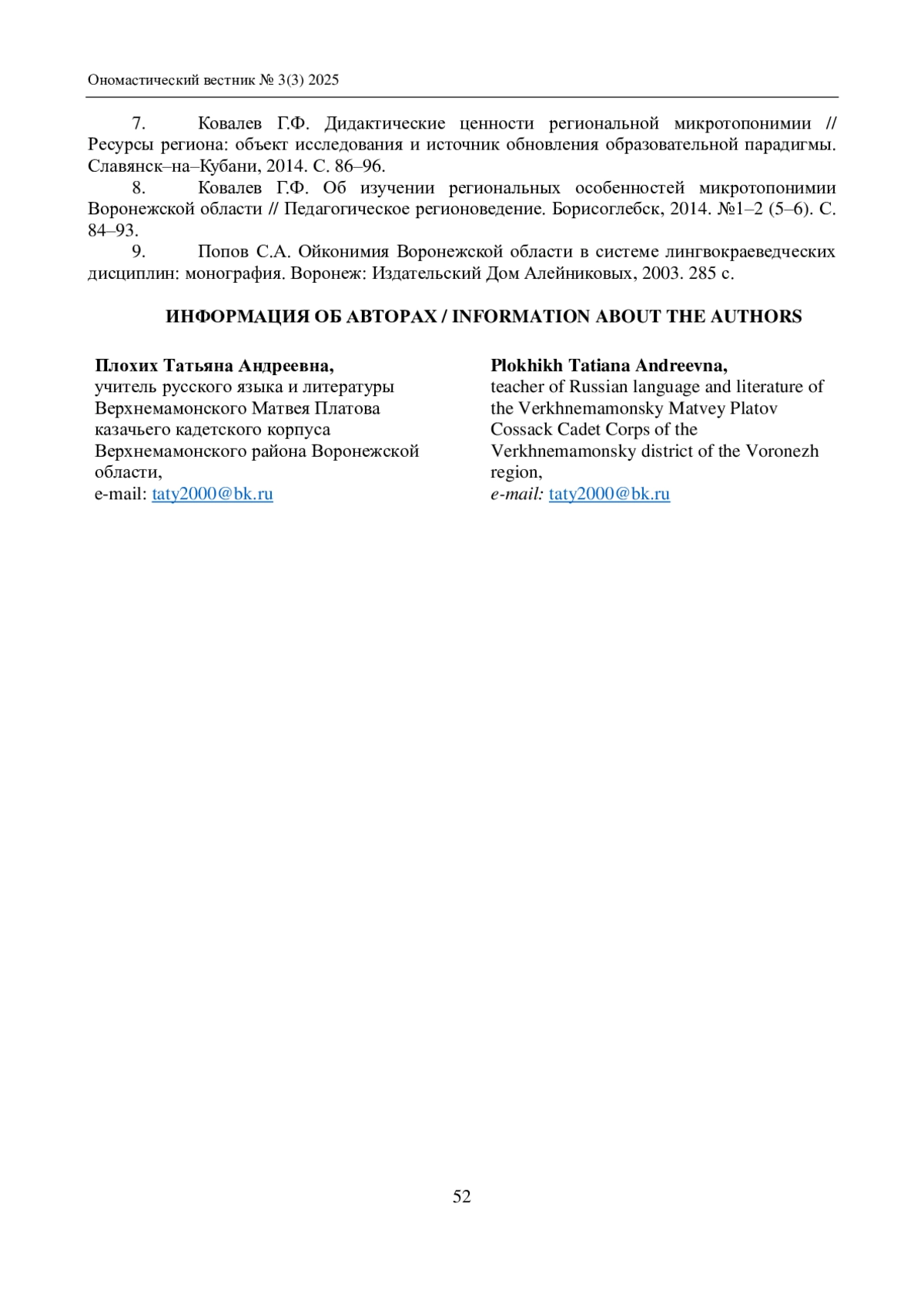 7. Ковалев Г.Ф. Дидактические ценности региональной микротопонимии // Ресурсы региона: объект исследования и источник обновления образовательной парадигмы. Славянск-на-Кубани, 2014. С. 86-96.