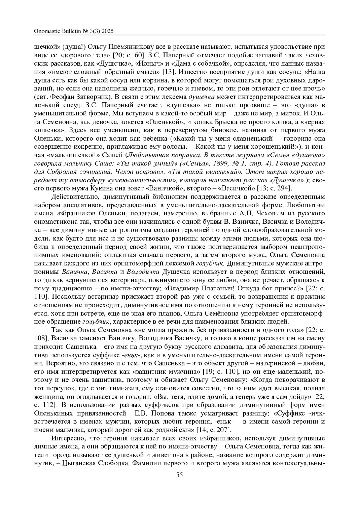 Статья посвящена исследованию ономастического пространства чеховского рассказа «Душечка», выяв-лению роли имен собственных в формировании образа главной героини – Оленьки Племянниковой – и других персонажей. Отмечается, что А. П. Чехов придавал значение именам, продумывал антропонимы и топонимы, в связи с чем они несут в тексте рассказа определенную смысловую нагрузку. Рассмотрение ономастикона начинается с анализа библионима «Душечка», который предопределяет выбор не только онимных, но и апеллятивных элементов с диминутивными суффиксами. Анализируются также топонимы и другие онимные единицы, встречающиеся в тексте, отмечается, что имена собственные способствуют созданию атмосферы провинциального городка конца XIX века и углубляют понимание психологических особенностей персонажей.