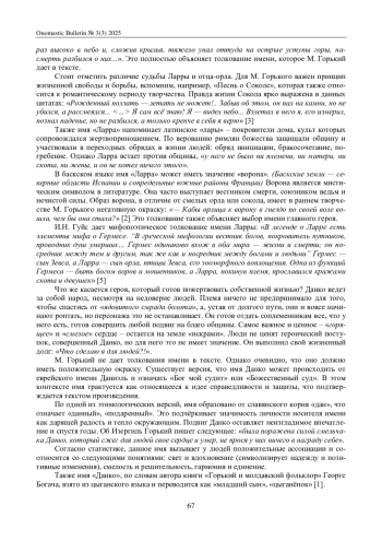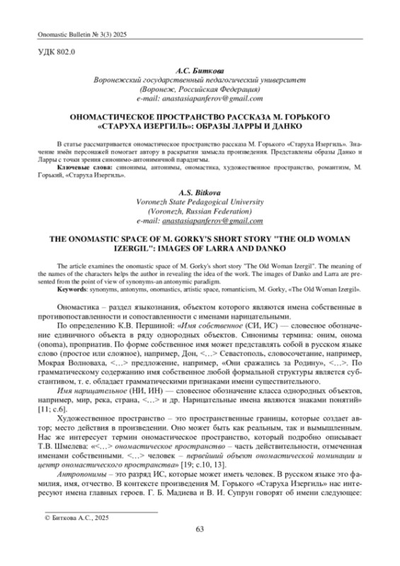 В статье рассматривается ономастическое пространство рассказа М. Горького «Старуха Изергиль». Значение имён персонажей помогает автору в раскрытии замысла произведения. Представлены образы Данко и Ларры с точки зрения синонимо-антонимичной парадигмы.