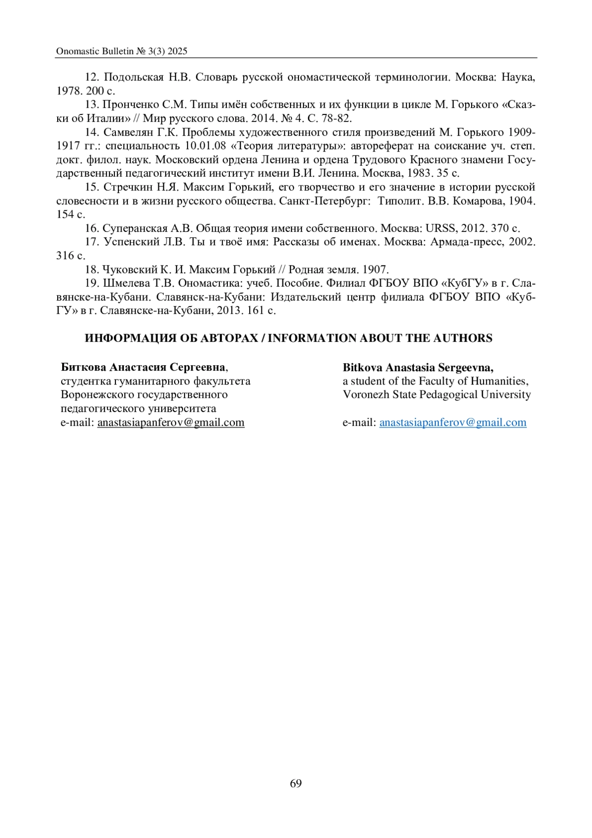 13. Пронченко С.М. Типы имён собственных и их функции в цикле М. Горького “Сказки об Италии” // Мир русского слова. 2014. № 4. С. 78-82.