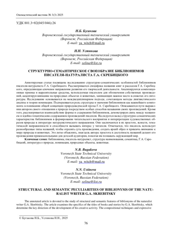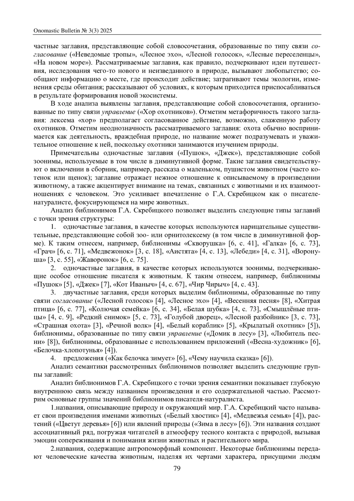 Аннотируемая статья посвящена исследованию структурно-семантических особенностей библионимов писателя-натуралиста Г. А. Скребицкого. Рассматривается специфика названия книг и рассказов Г. А. Скребицкого, определяющая ключевое направление развития его творческой деятельности. Анализируются композиционные приемы и выразительные средства, используемые писателем для обозначения собственных произведений, акцентируя внимание на природных объектах и животных, занимающих важное место в сюжетах его лите-ратуры. Исследование основывается на междисциплинарном подходе, сочетающем методы лингвистического анализа и теории номинации. Подчеркивается роль структуры и значения библионимов как важнейшего компонента в понимании общей концепции природоведческой прозы Г. А. Скребицкого. Описываются пути выражения автором своего отношения к природе посредством особых способов называния своих произведений. Кроме того, рассматривается взаимодействие формы и содержания библионимов, демонстрируя связь между названием и идейно-тематическим содержанием произведений писателя. Исследуется вклад структурно-семантических характеристик библионимов в формирование читательского восприятия и интерпретации художественных образов природы в литературе натуралистического направления. Они заключаются в их простоте, ясности, тематической направленности и способности вызывать интерес у читателя. Отмечается, что писатель использует разнообразные типы названий, чтобы отразить суть произведения, создать яркий образ и привлечь внимание к миру природы и животных. Это легко объяснить, зная цель автора: простота и доступность названий делают его произведения привлекательными для детской аудитории, помогая им познавать окружающий мир.