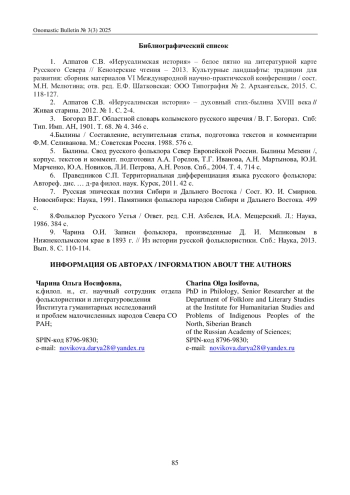 9. Чарина О.И. Записи фольклора, произведенные Д. И. Меликовым в Нижнеколымском крае в 1893 г. // Из истории русской фольклористики. Спб.: Наука, 2013. Вып. 8. С. 110-114.