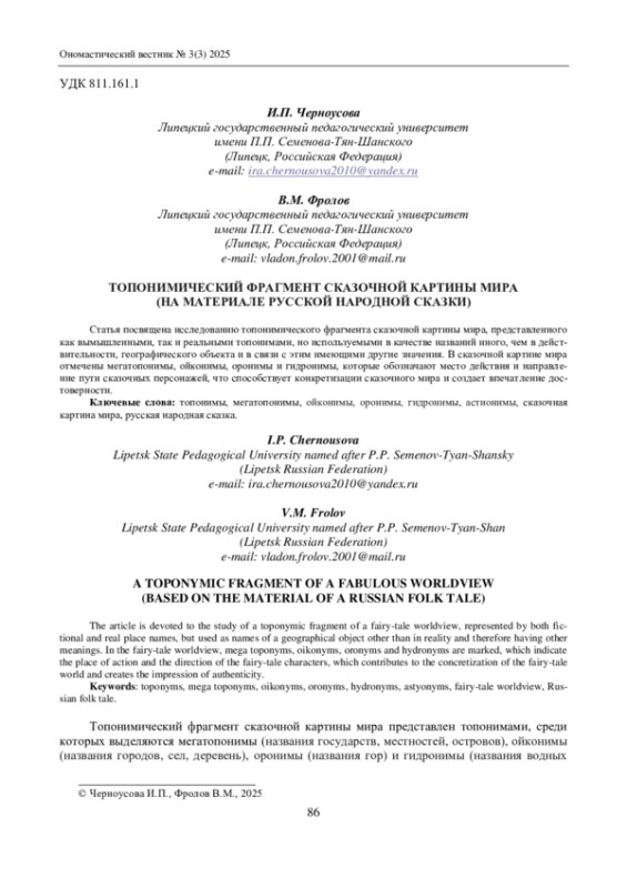 Статья посвящена исследованию топонимического фрагмента сказочной картины мира, представленного как вымышленными, так и реальными топонимами, но используемыми в качестве названий иного, чем в действительности, географического объекта и в связи с этим имеющими другие значения. В сказочной картине мира отмечены мегатопонимы, ойконимы, оронимы и гидронимы, которые обозначают место действия и направление пути сказочных персонажей, что способствует конкретизации сказочного мира и создает впечатление достоверности.